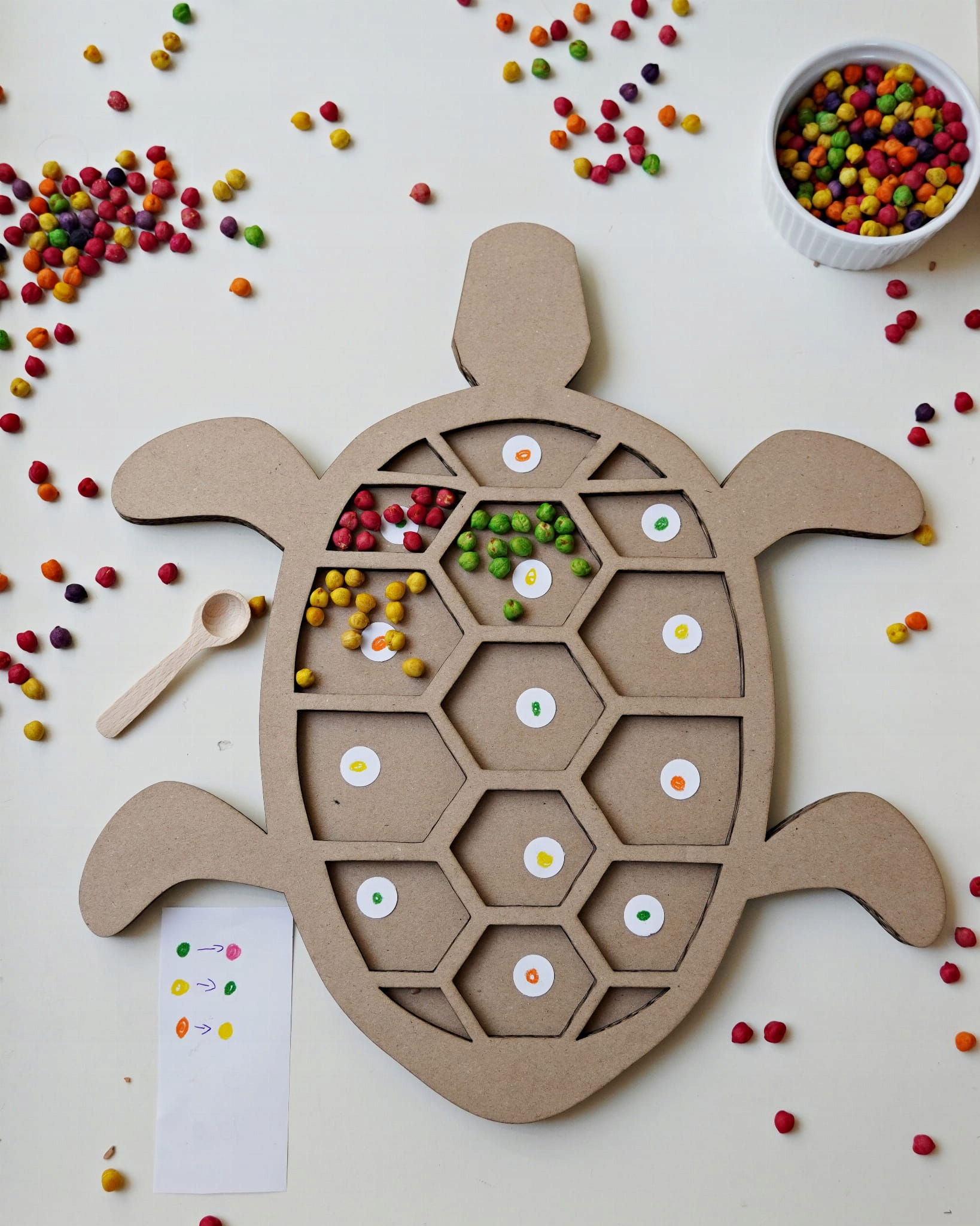 Набір складається з картонної моделі черепахи та однієї упаковки кольорового нута в 100 г зелених та одна упаковка кольорового рису в коричневому 100 г.