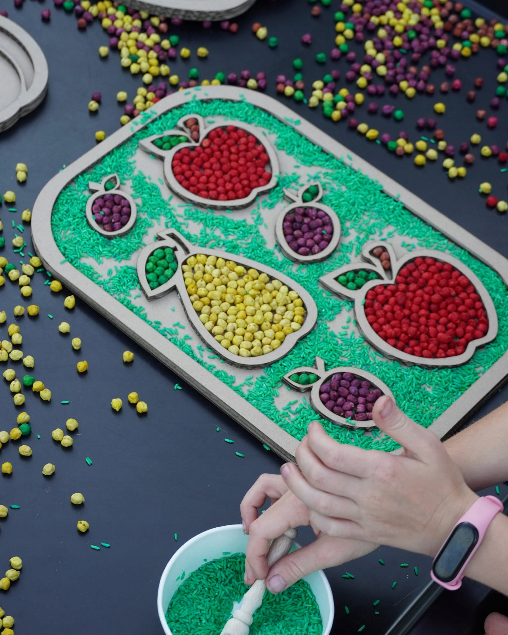 Набір складається з картонного розливу фруктів, однієї упаковки пофарбованого зеленого рису та однієї упаковки кольорового нута червоного, жовтого, фіолетового, зеленого в цілому 300 г.