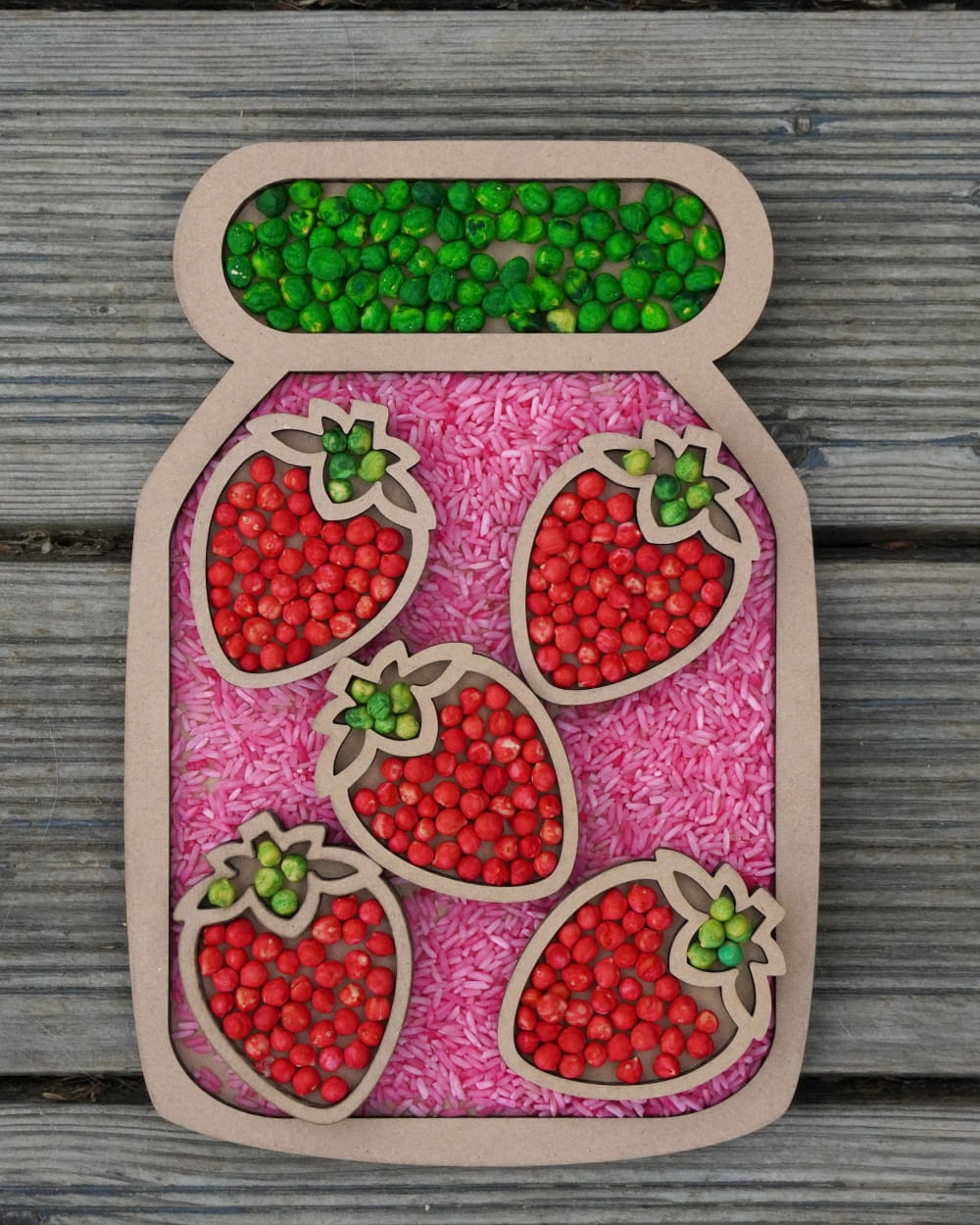 Набір складається з картонної банки у формі банки, 5 частин картонної полуниці, однієї упаковки фарбованого рожевого рису 200 г та одна пачка пофарбованого нуту червоного та зеленого кольору в цілому 200 г.