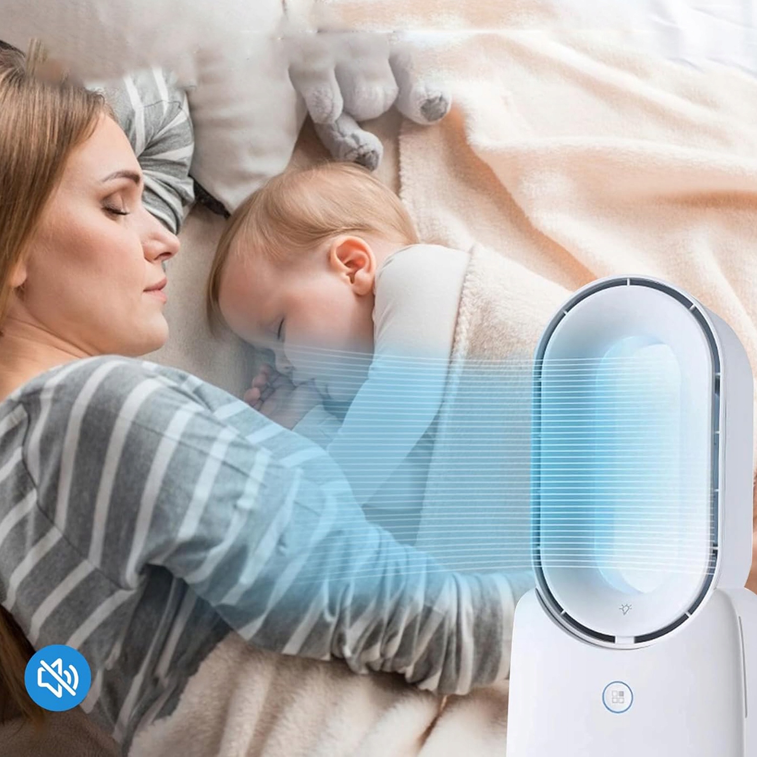 - Хоча вентилятор генерує швидкий потік повітря, ці вентилятори спокійні і виробляють потрібну кількість білого шуму (менше 20-50 дБ), що забезпечує максимальний комфорт і забезпечує добрий нічний сон.