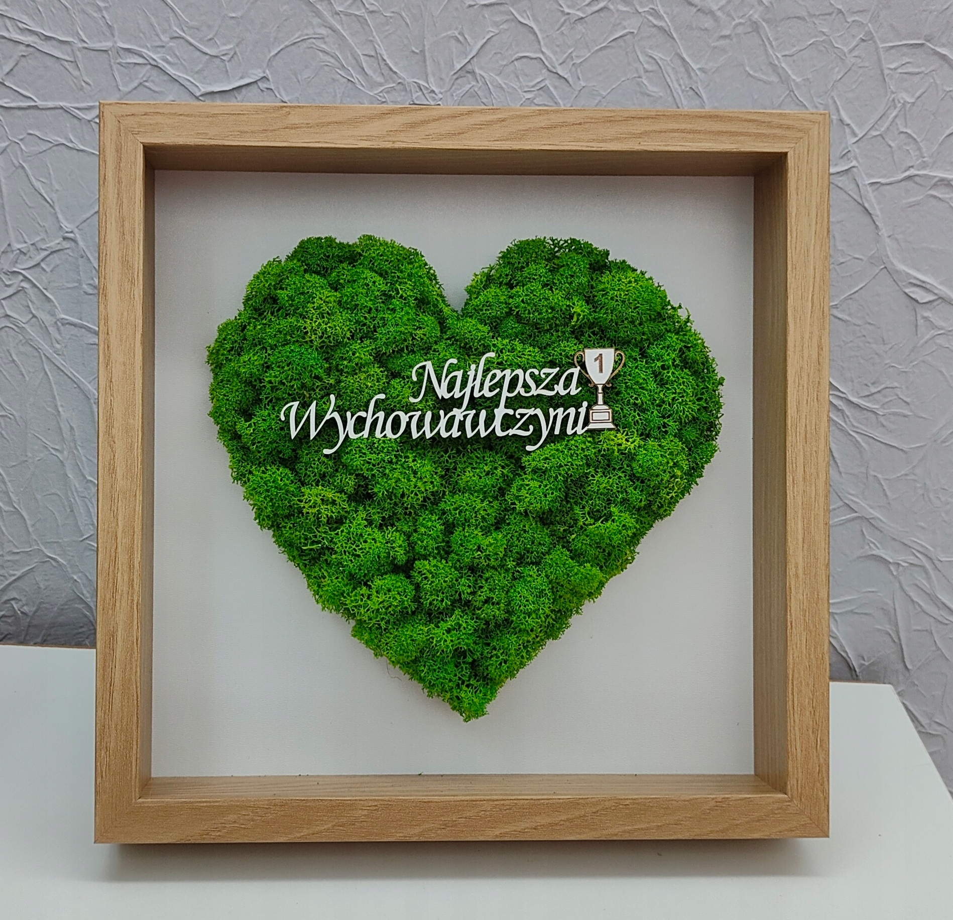 Живе серце з фінського моху з будь-яким написом, розміщене в білій рамці, стане чудовим подарунком до Дня вчителя / народної освіти або кінця навчального року.