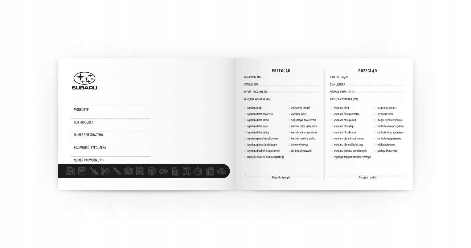 Книга обслуговування присвячена автомобілям Subaru . Він містить усі необхідні стовпці, тобто інформацію про транспортний засіб, перевірки та ремонт, а також простір для додаткових нотаток. Набір також включає дві примірники угоди про купівлю та продажу автомобіля та заяву про інцидент дорожнього руху.