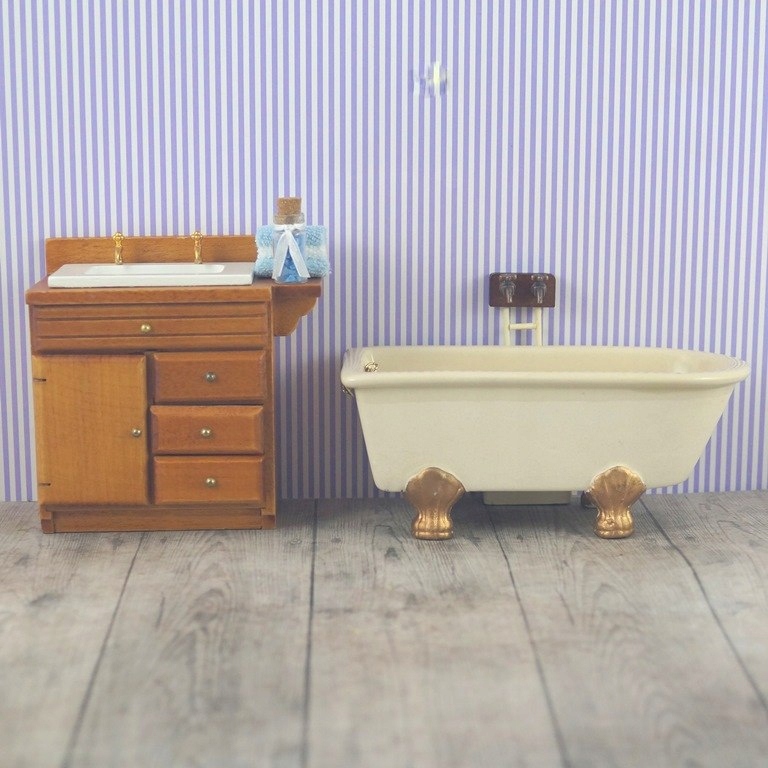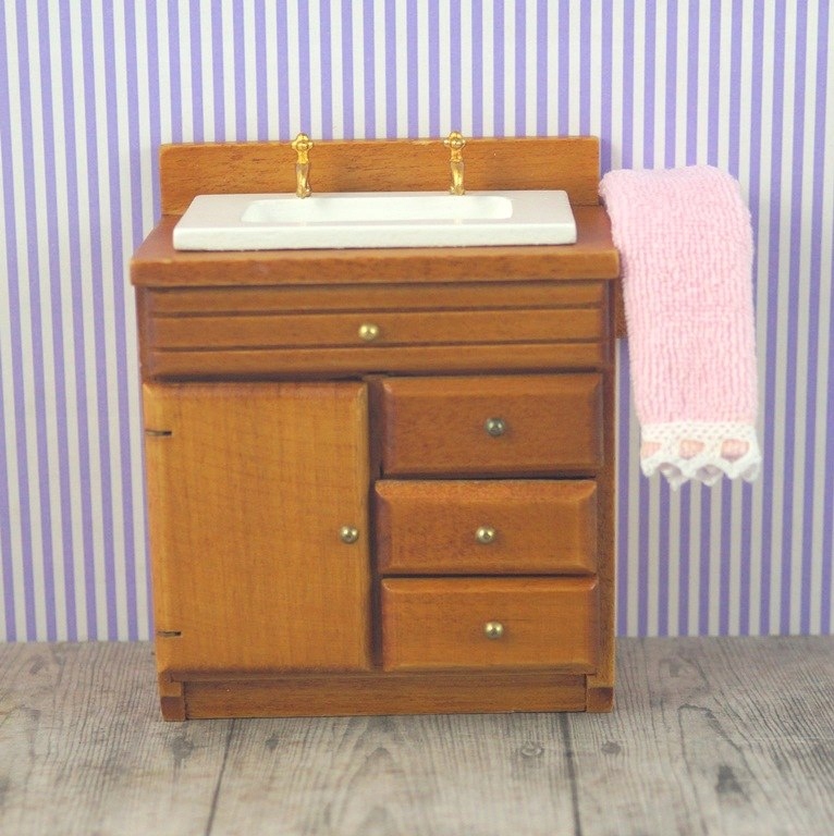 Тамба з умивальником дерев'яна, ляльковий будиночок масштаб 1:12. Розміри шафи: висота 93 мм, ширина 93 мм, глибина 50 мм. Шафа має дверцята, що відкриваються, і 3 ящика (верхній великий ящик - фіксований). Крани металеві, безкоштовно додаємо до шафи рожевий рушник.