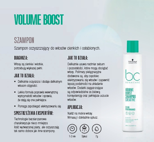 Серія BC Volume Boost завдяки формулі з креатином відновлює волокна волосся та розгладжує поверхню, полегшуючи укладку. Більший обсяг до 48 годин! Відчуття повнішого волосся. Покращена еластичність кожного пасма. Нова косметика з лінії Bonacure має чистий веганський склад без сульфатів, силіконів, парабенів, мінеральних масел, мікропластику та штучних барвників. Вони добре біологічно розкладаються. Нова упаковка є екологічно чистою. Вони підлягають вторинній переробці та виготовлені на 97% із переробленого пластику.