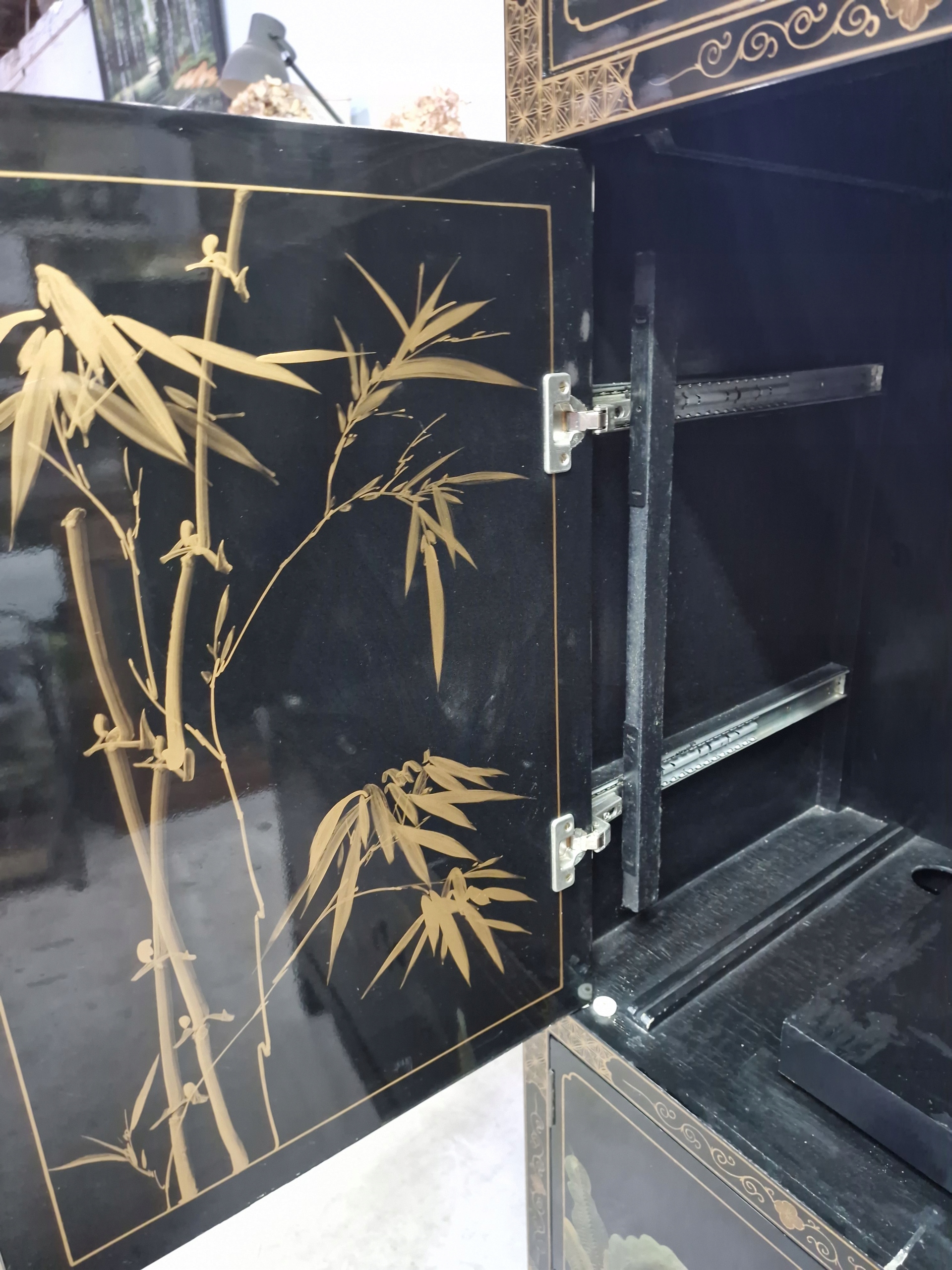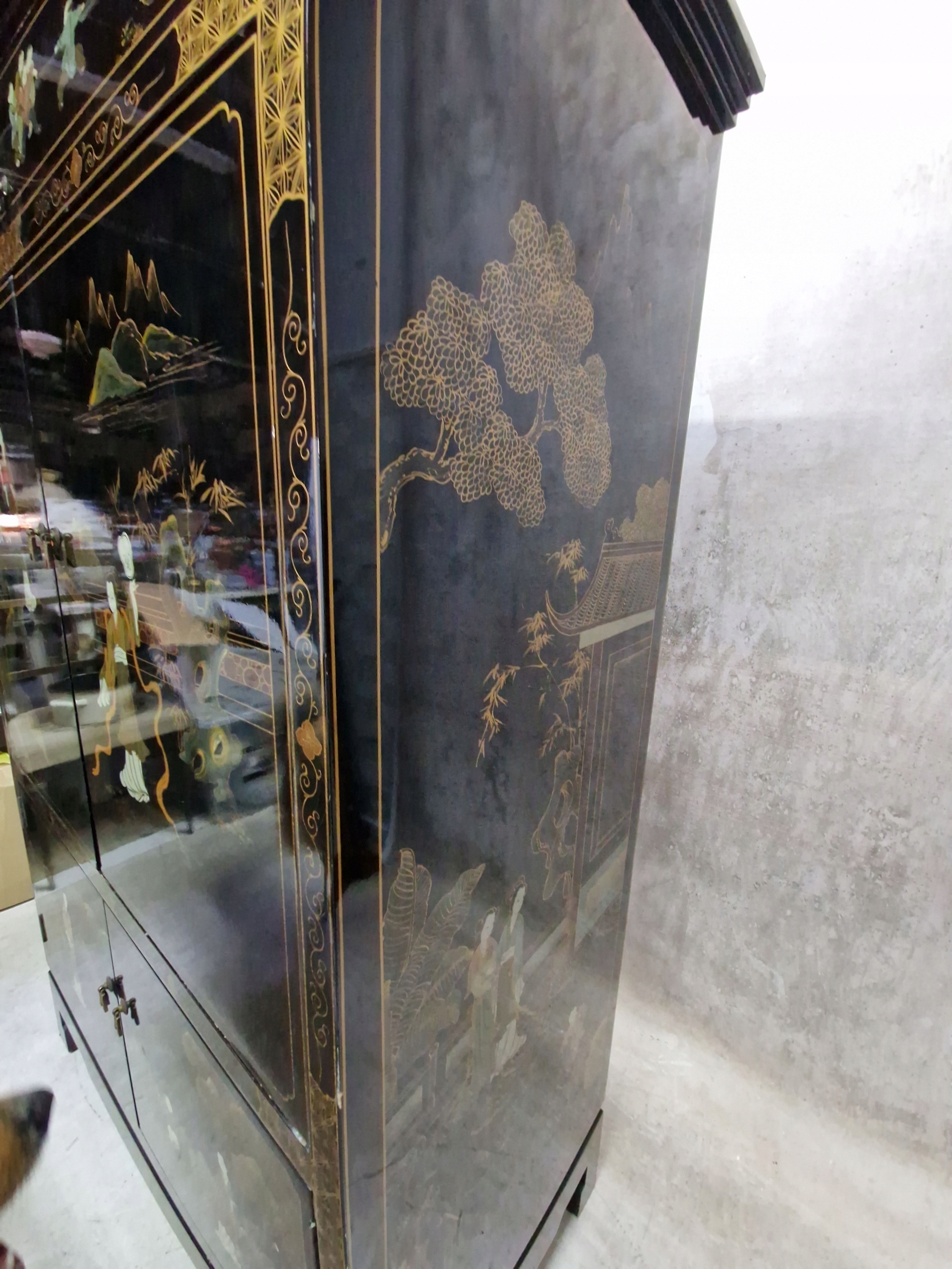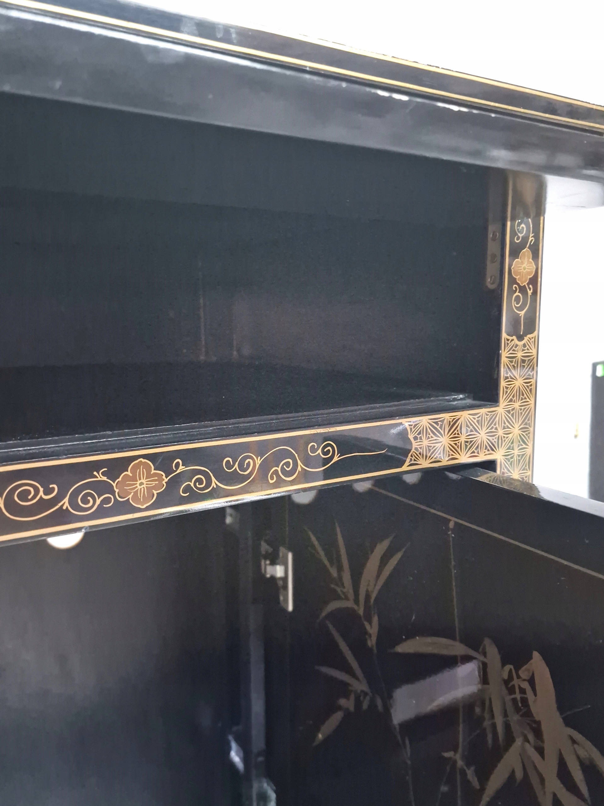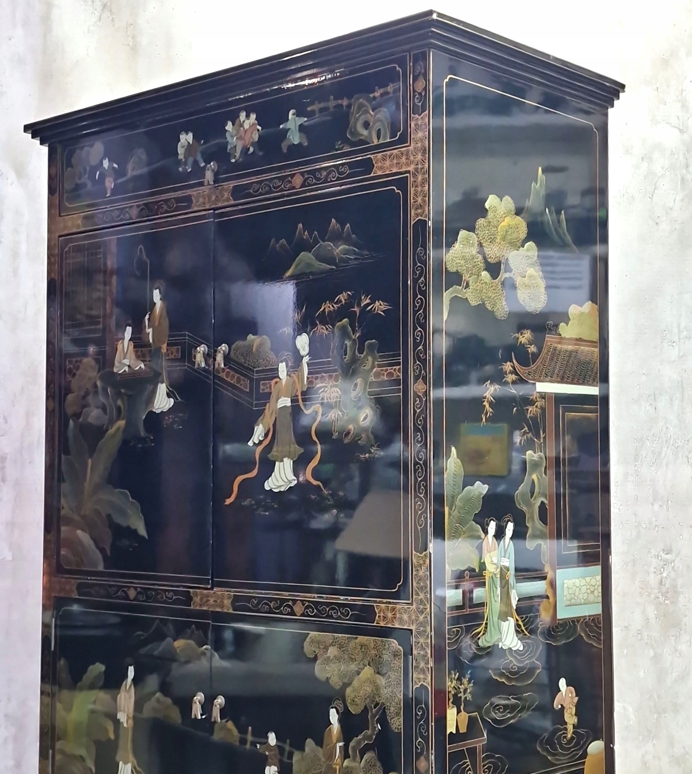 Чорна шафа з відтінками золота, багато декорована – візерунки, розписані вручну, фігури в кімоно тощо.