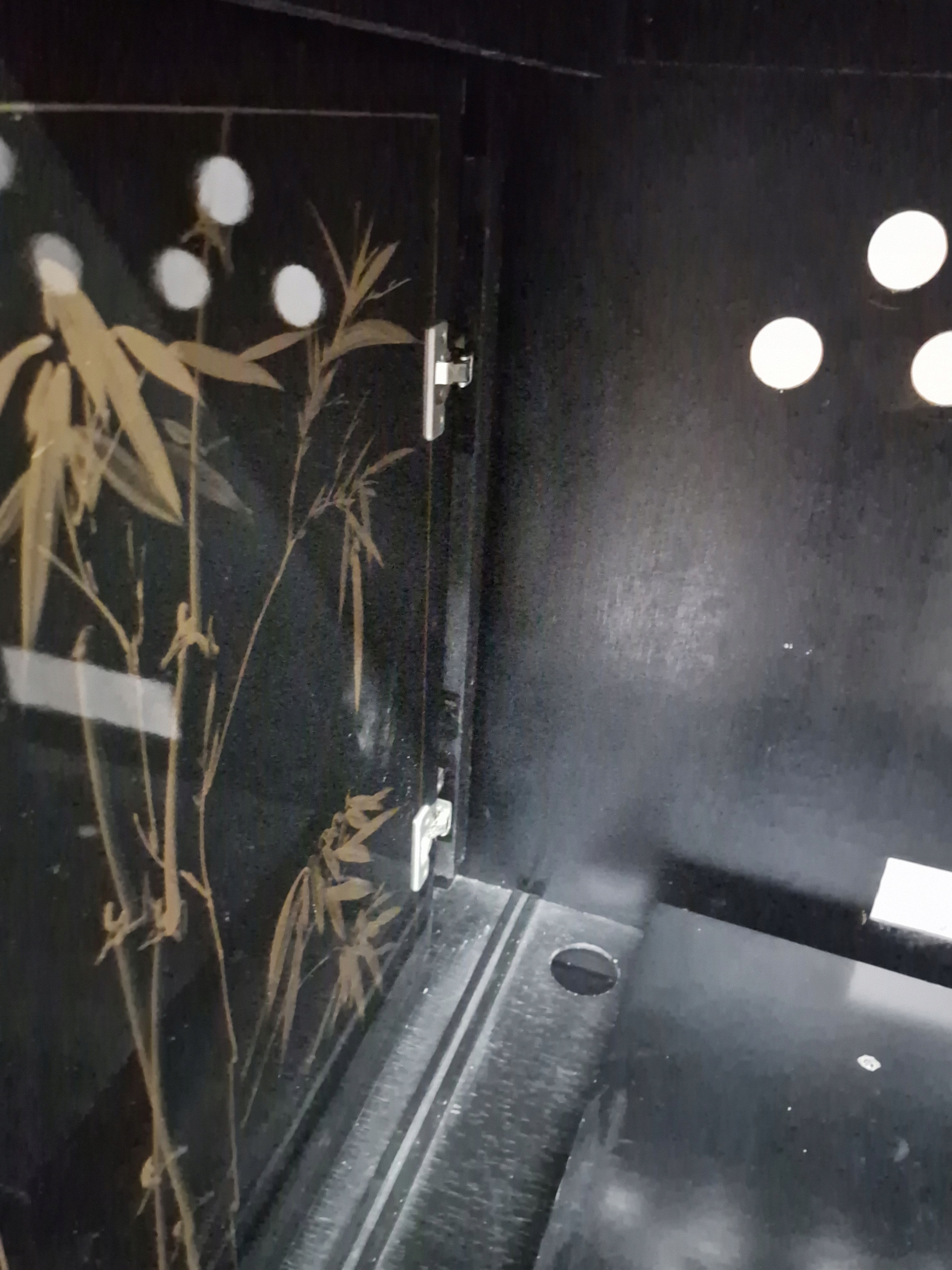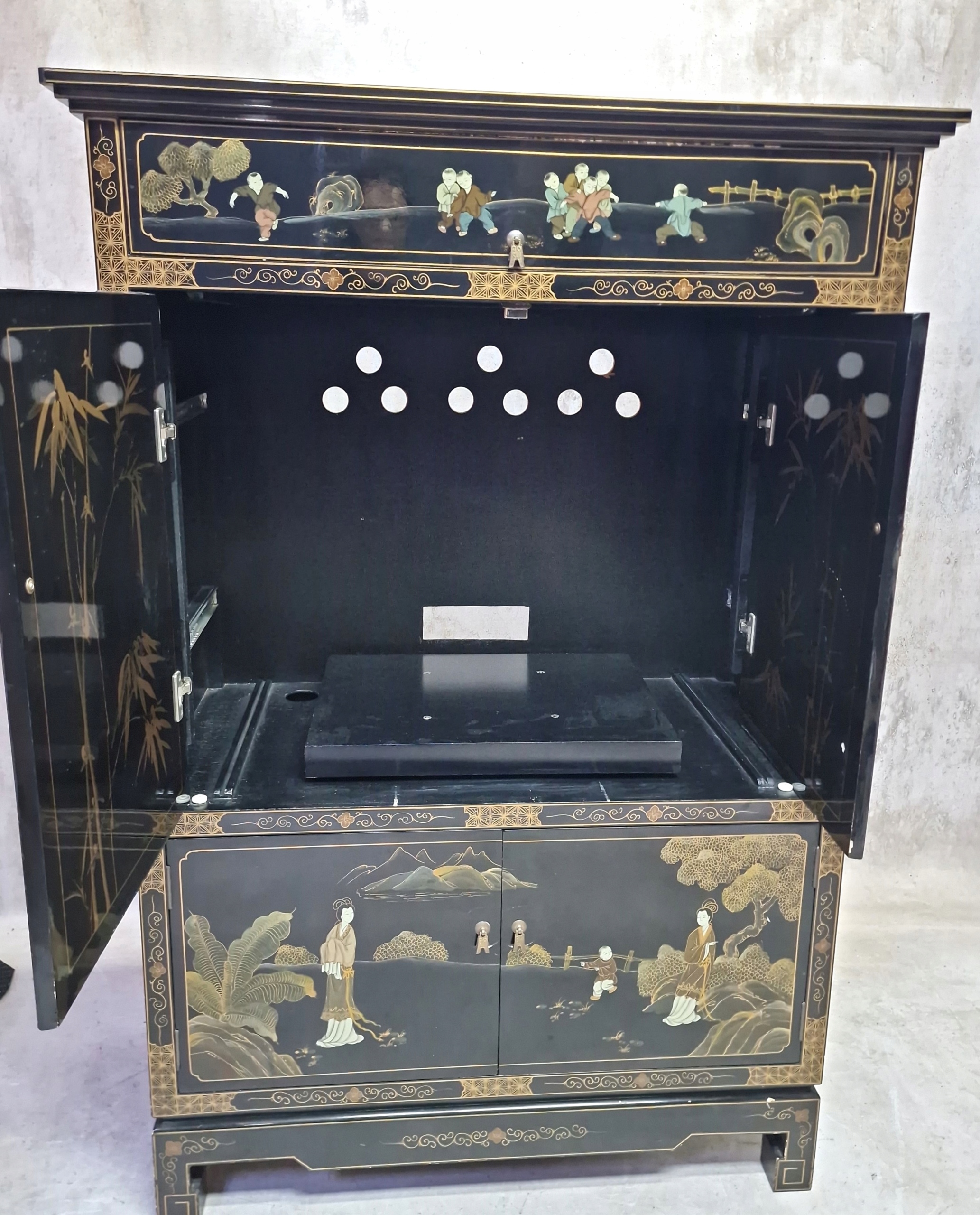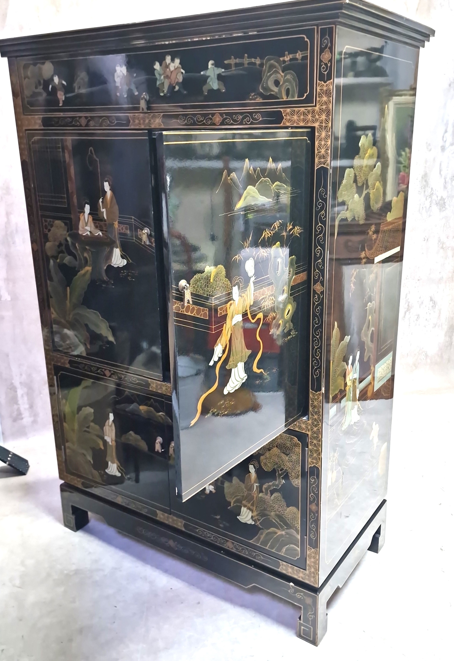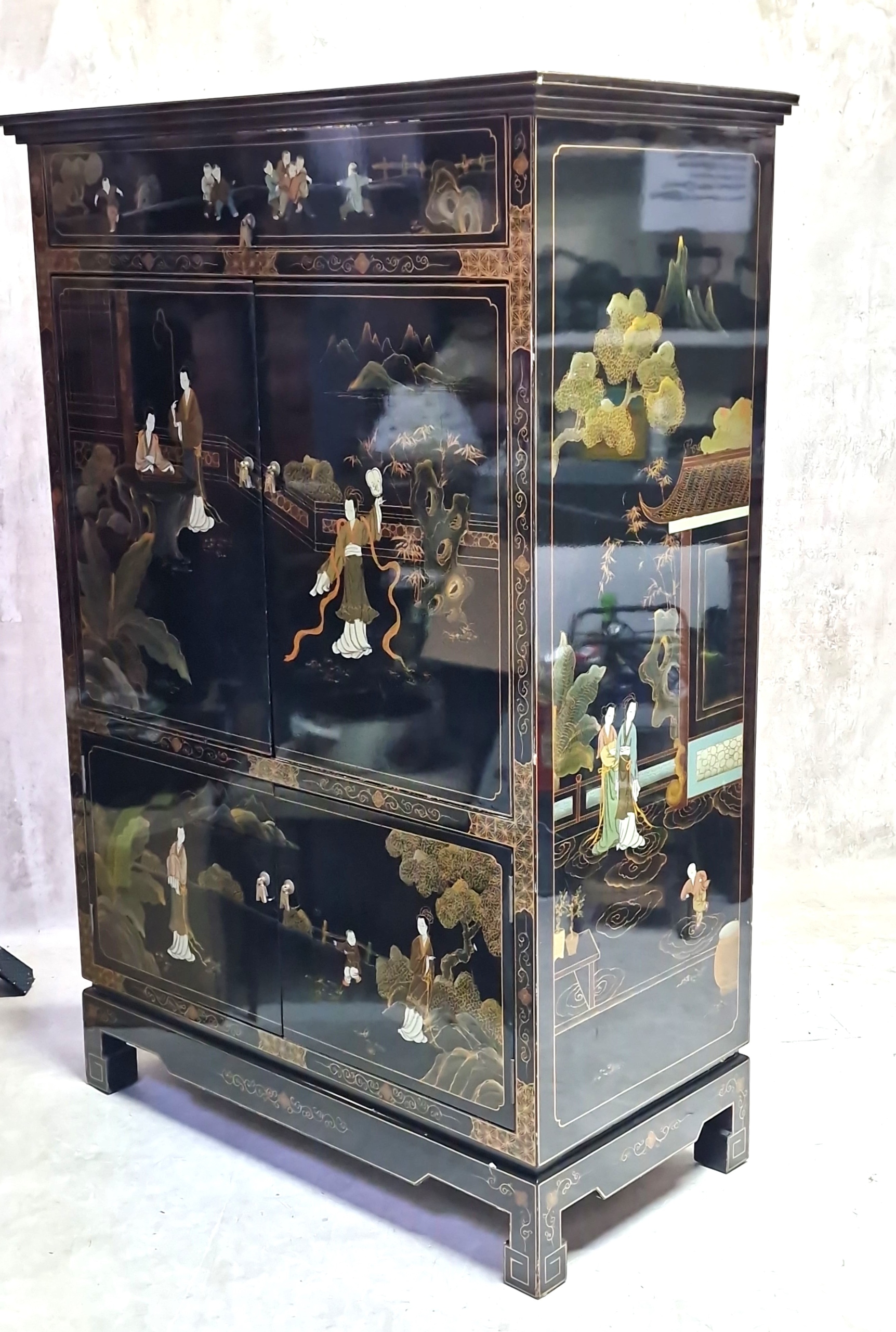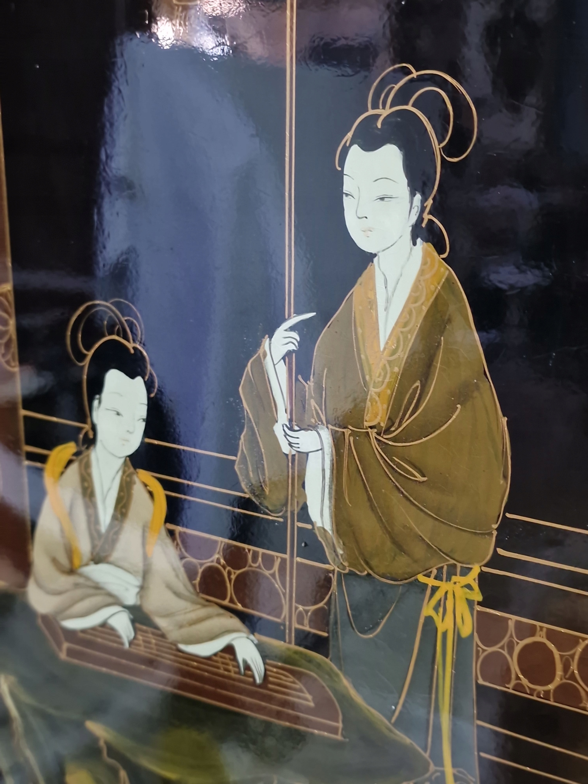 Чорна шафа з відтінками золота, багато декорована – візерунки, розписані вручну, фігури в кімоно тощо.