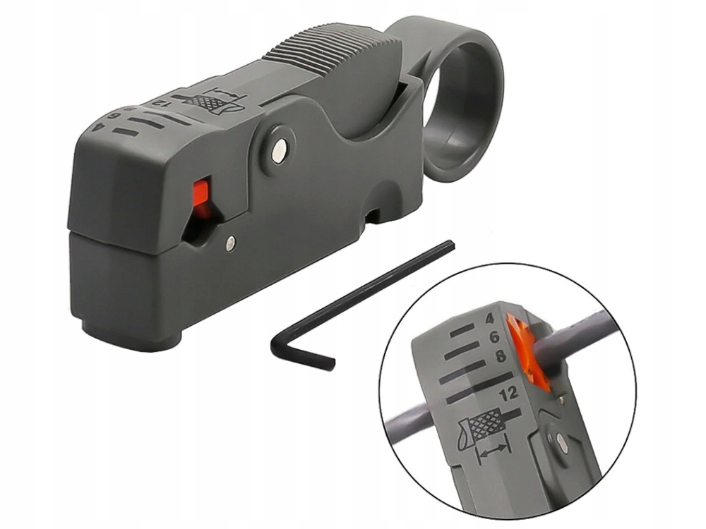 Стріптер для зняття ізоляції є надзвичайно корисним пристроєм для зняття ізоляції з кінців коаксіальних кабелів. Забезпечує швидке зняття ізоляції, пристрій оснащений двома регульованими лезами, які регулюються ключем, що входить в комплект. Регулювання ширини лівого екрана: 4, 6, 8 і 12 мм.