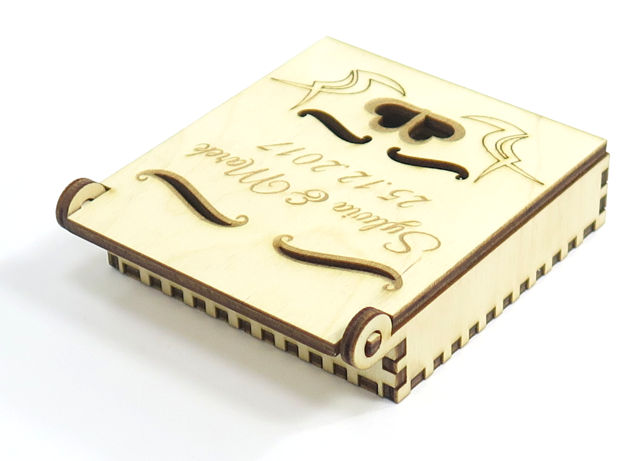 фанерну коробку товщиною 3 мм із кришкою, що відкривається, і зовнішні розміри: 7,5x7,5x1,8 см із гравіюванням