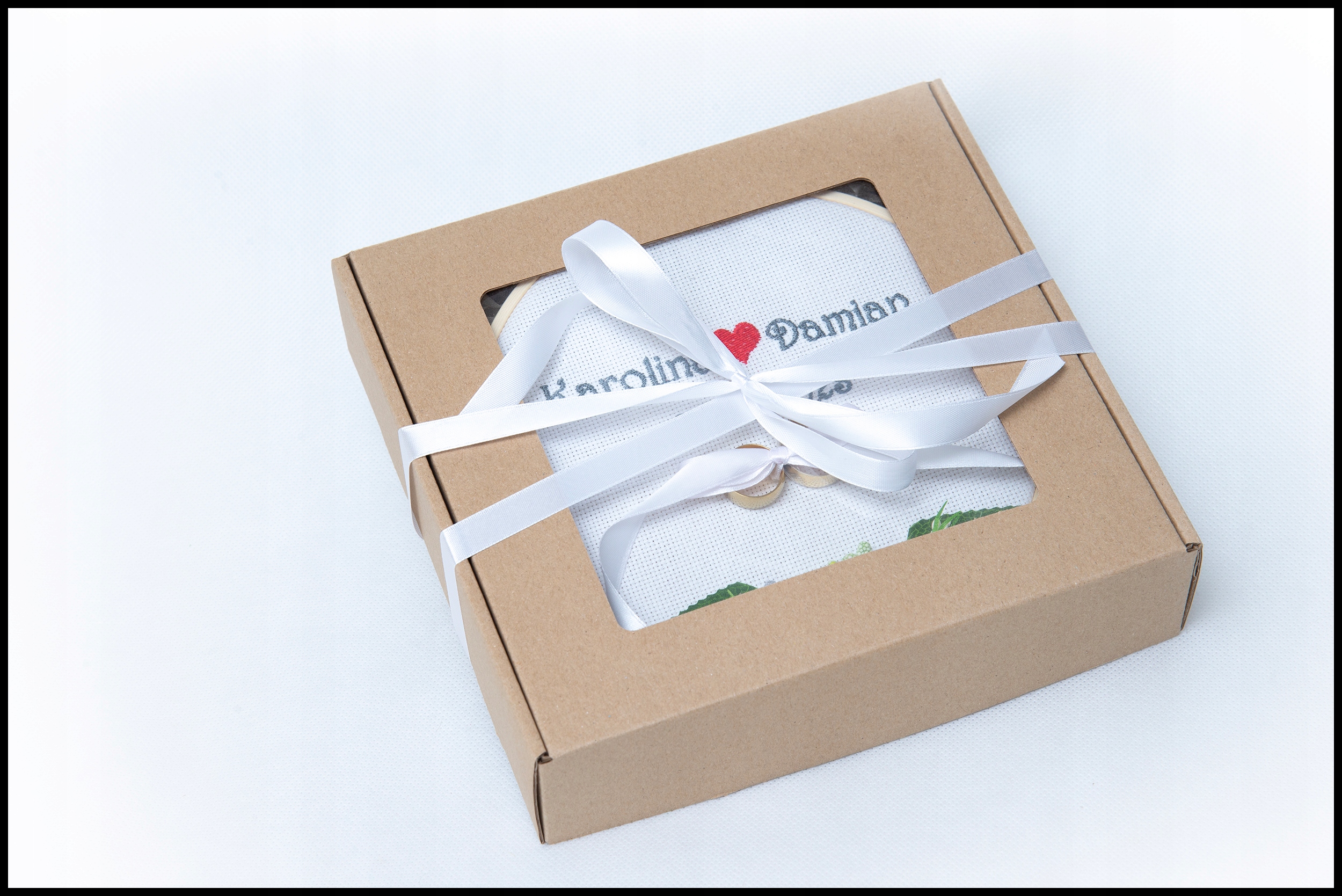 Красива вишивка, на якій можна написати імена та дату весілля - все це прикрашено елегантний квітковий декор.