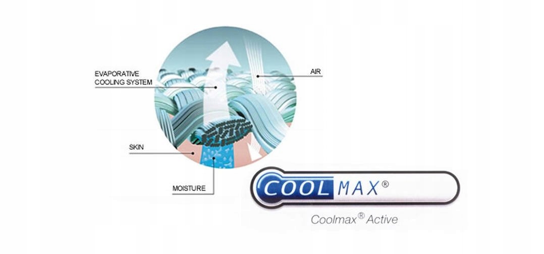 coolmax - це технологічно розвинене поліефірне волокно. Його чотириканальна конструкція - запатентована Du Pont - забезпечує чудові властивості, такі як: піт на вулиці, а також випаровування та відмінна дихання. Це волокно має чудові гідрофобні властивості. Він дуже швидко висихає і не приймає неприємних запахів.