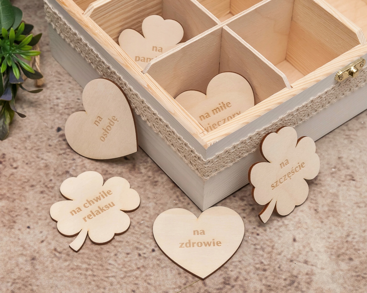 Дерев'яна скринька з оригінальним персоналізованим гравіюванням, побажаннями всередині, прикрашена червоними сердечками та декоративним мереживом (вибирається випадковим чином), закривається елегантною застібка золотого кольору, 6 відділень.