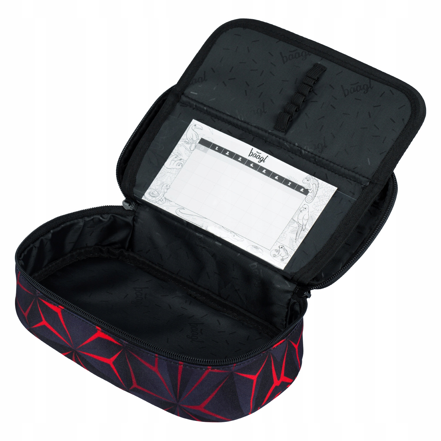 Місткий пенал з геометричним мотивом і логотипом BAAGL. Пенал містить основне відділення та кишеню з клапаном із перегородкою та гумками для олівців та іншого письмового приладдя.
