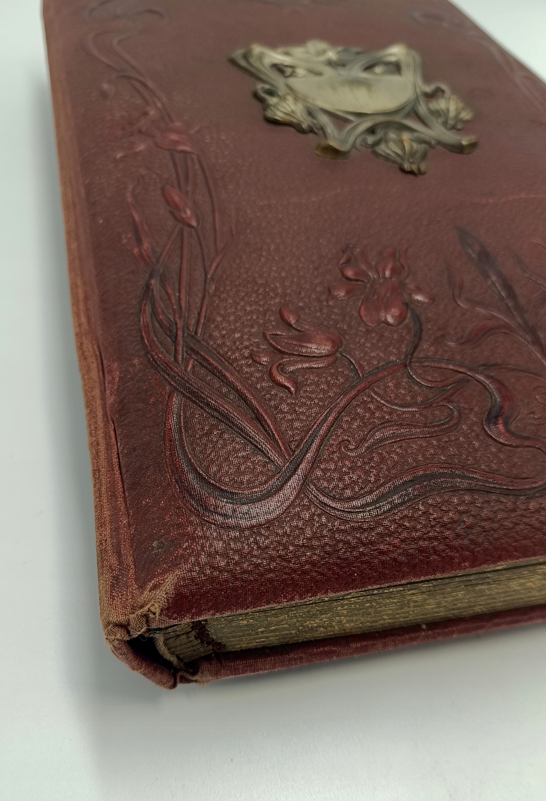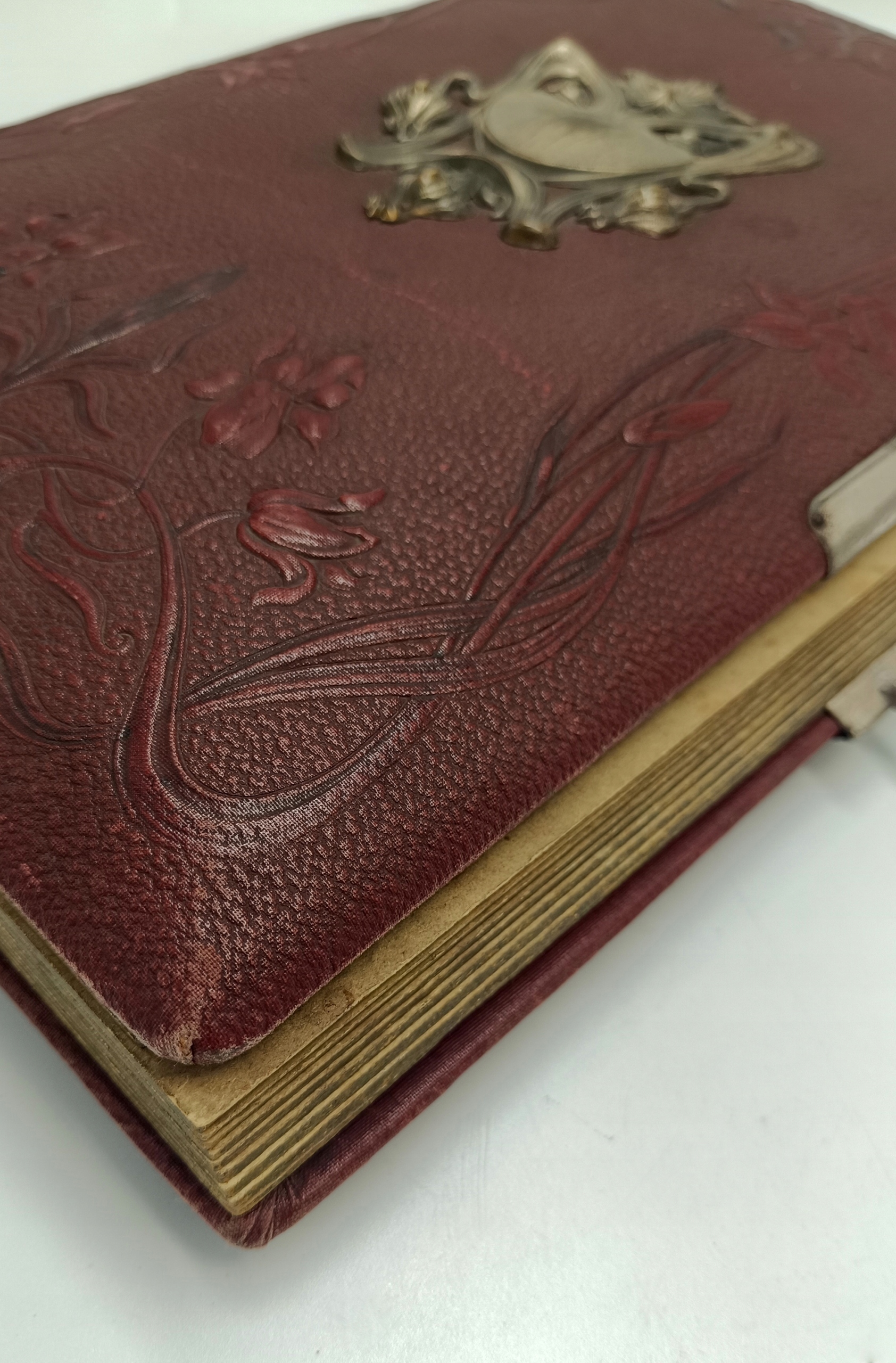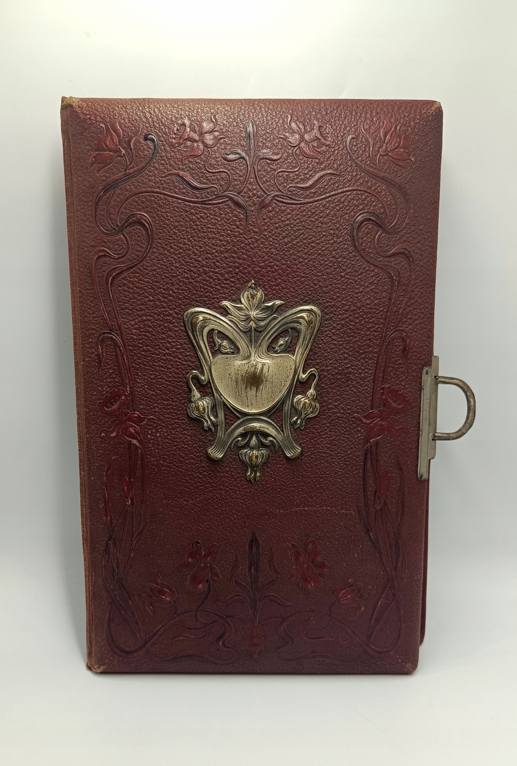 Ми представляємо чарівний альбом Art Nouveau для фотографій. Датована близько 1900 року. Красива, темно -коричнева шкіра з чудовими квітковими тисненням фіалки та нарцисів. Всередині ви знайдете досить товсті сторінки, де є місця для вставки або вставки фотографій, і це два менші місця вгорі та на один більший внизу. Краї цих сторінок позолочені, що виглядає чудово і вражає захоплююче. Альбом розмістить 60 фотографій.