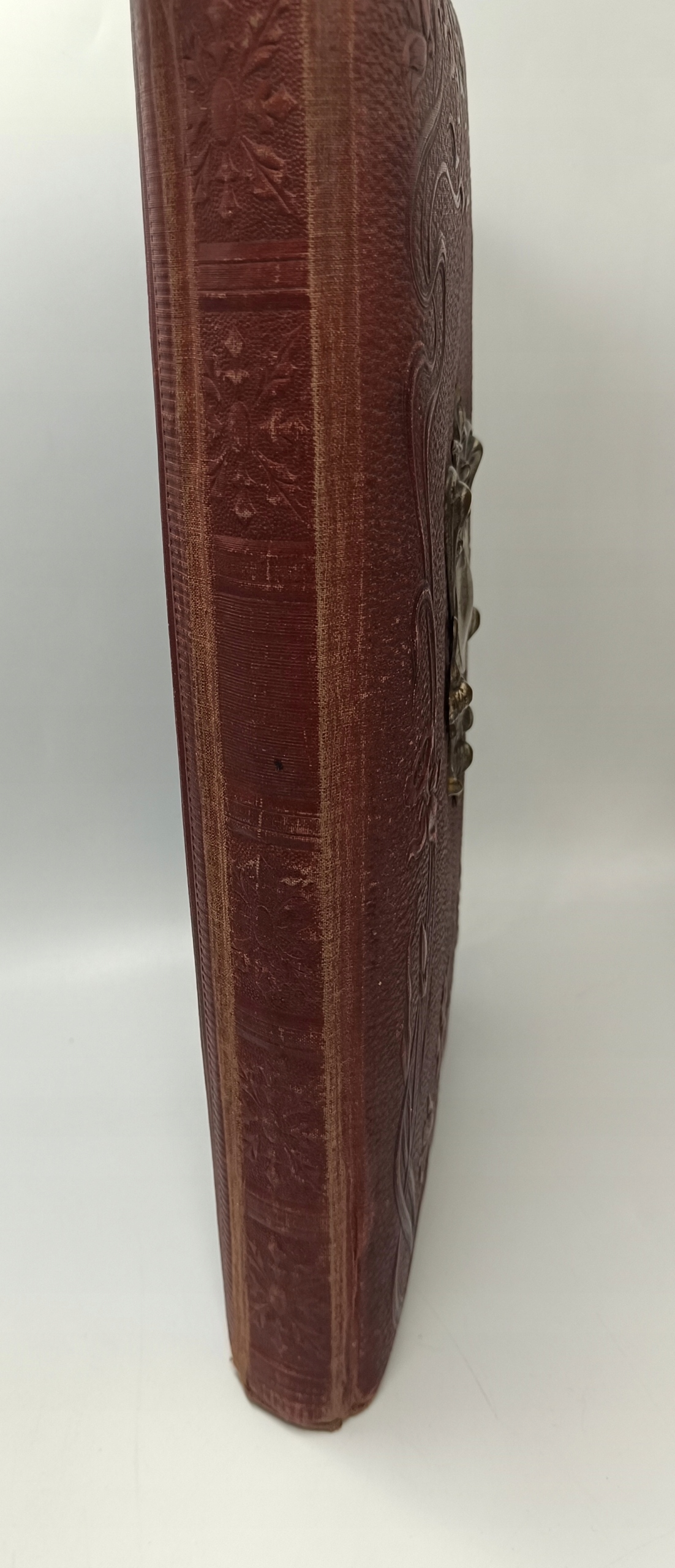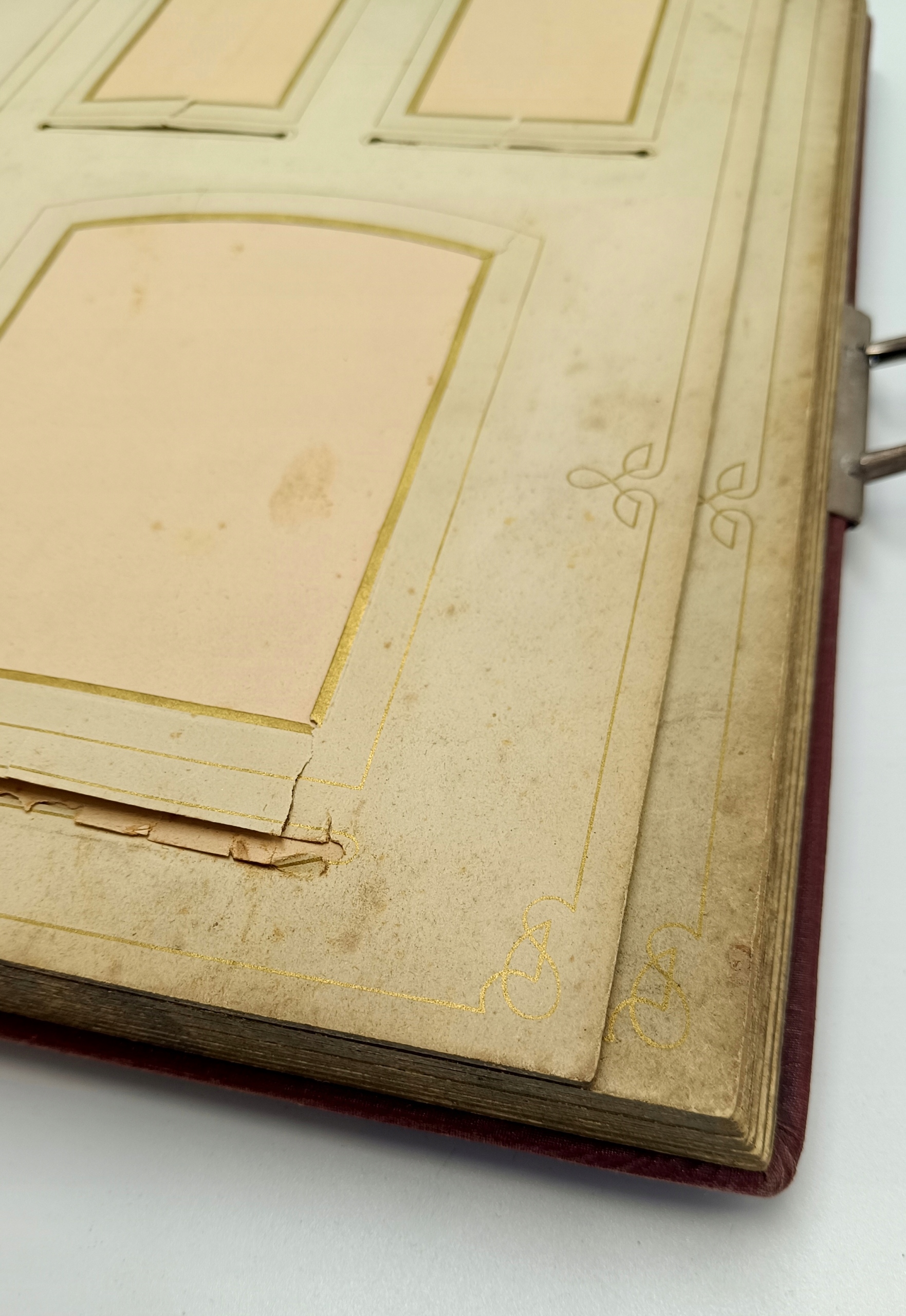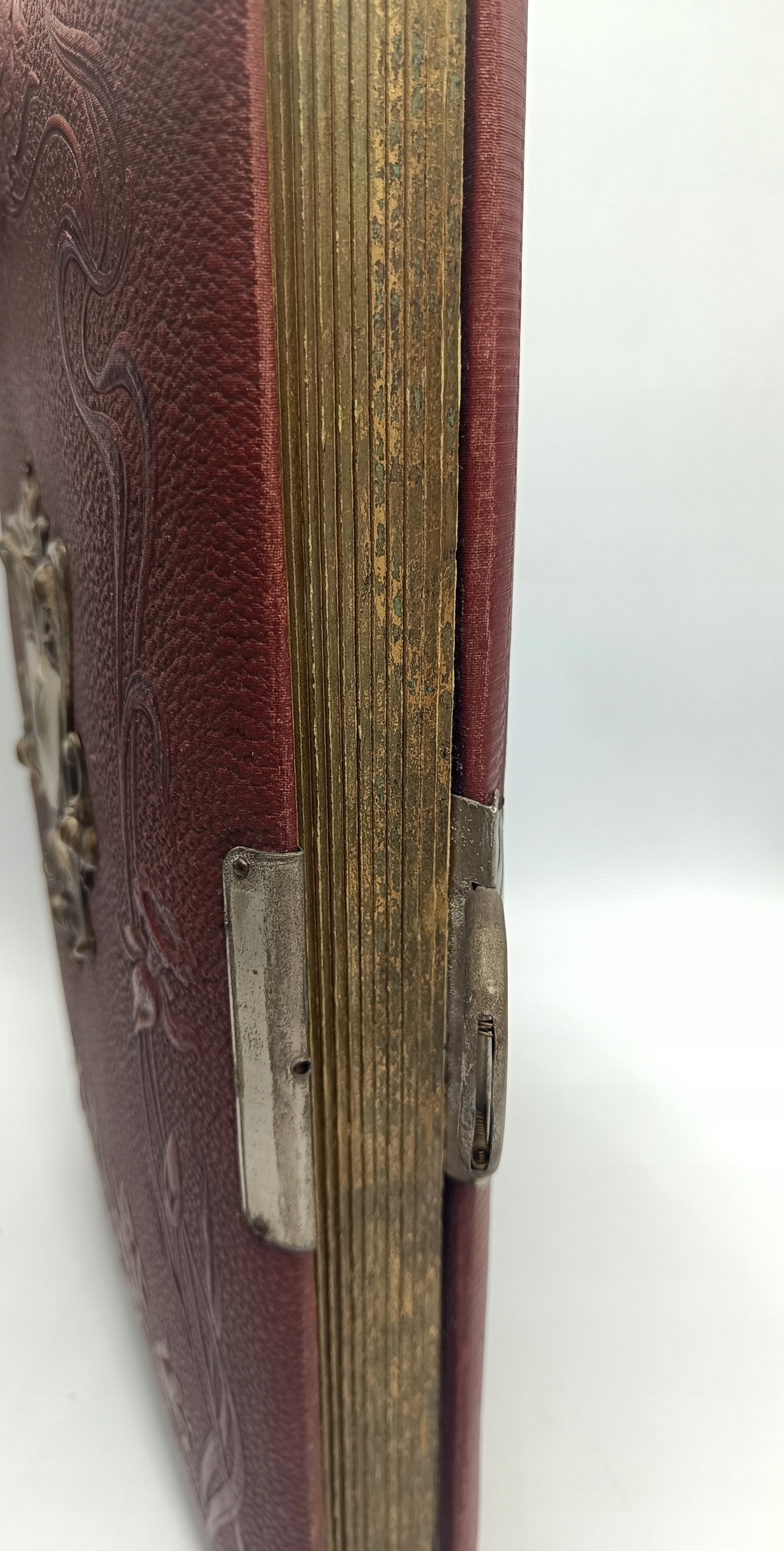 Ми представляємо чарівний альбом Art Nouveau для фотографій. Датована близько 1900 року. Красива, темно -коричнева шкіра з чудовими квітковими тисненням фіалки та нарцисів. Всередині ви знайдете досить товсті сторінки, де є місця для вставки або вставки фотографій, і це два менші місця вгорі та на один більший внизу. Краї цих сторінок позолочені, що виглядає чудово і вражає захоплююче. Альбом розмістить 60 фотографій.