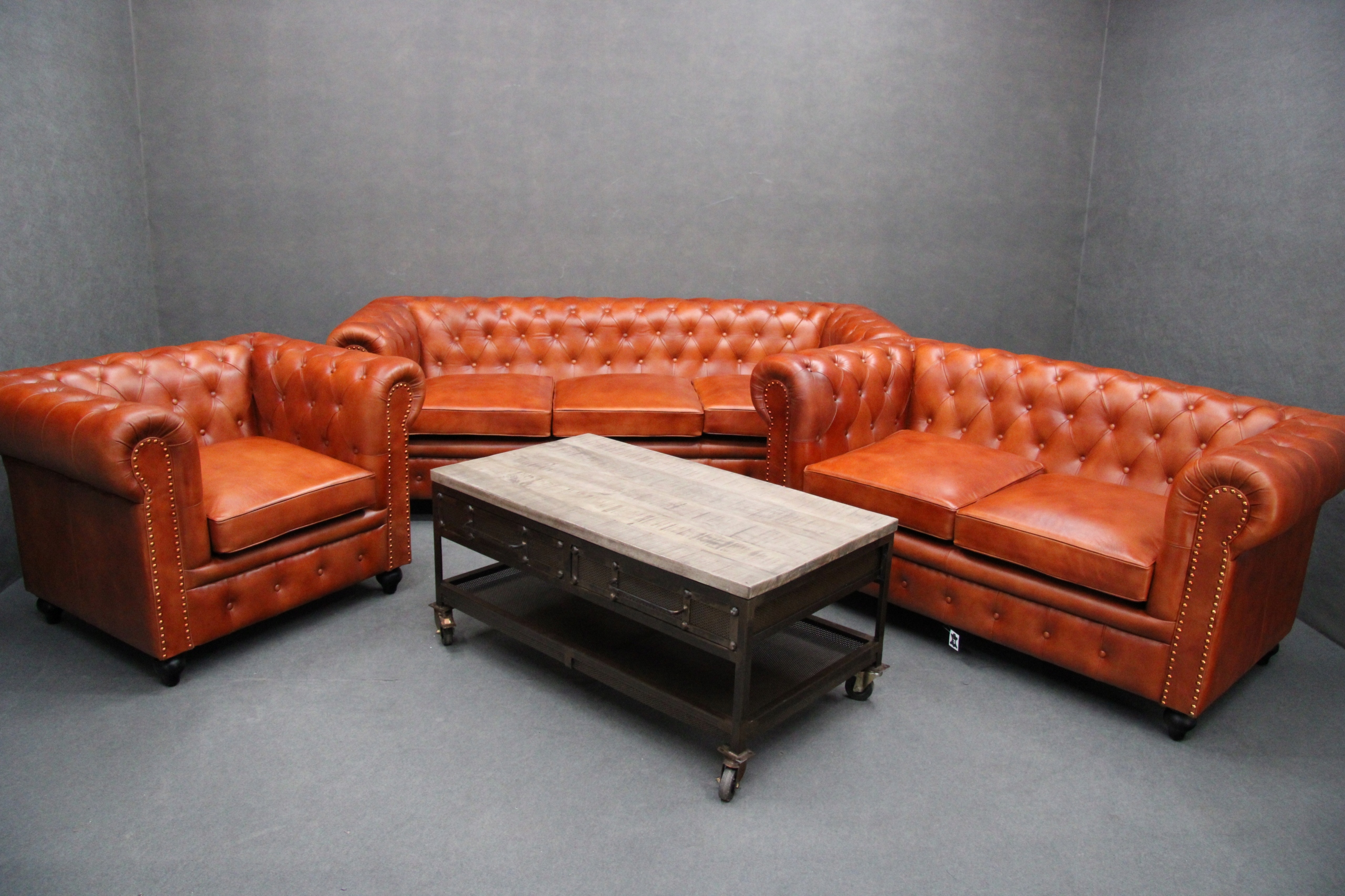 Набір новий. Виготовлений з натуральної шкіри з дерев'яними ніжками. Комплект складається з три- та двомісного дивана та крісла. Набір Chesterfield має елегантний та унікальний вигляд, завдяки шпилькам, стьобаній шкірі та швам набір набуває унікального характеру. На фото все видно. Подушки мають пінополіуретан, що робить комплект зручним і м'яким, також вони мають липучки, що не ковзають під час відпочинку, а можливість зняття подушок полегшує чистку решти. В основі конструкції лежить дерев’яний каркас, сидіння та спинка наповнені високопластичним пінополіуретаном, з додатковими хвильовими пружинами на сидінні.