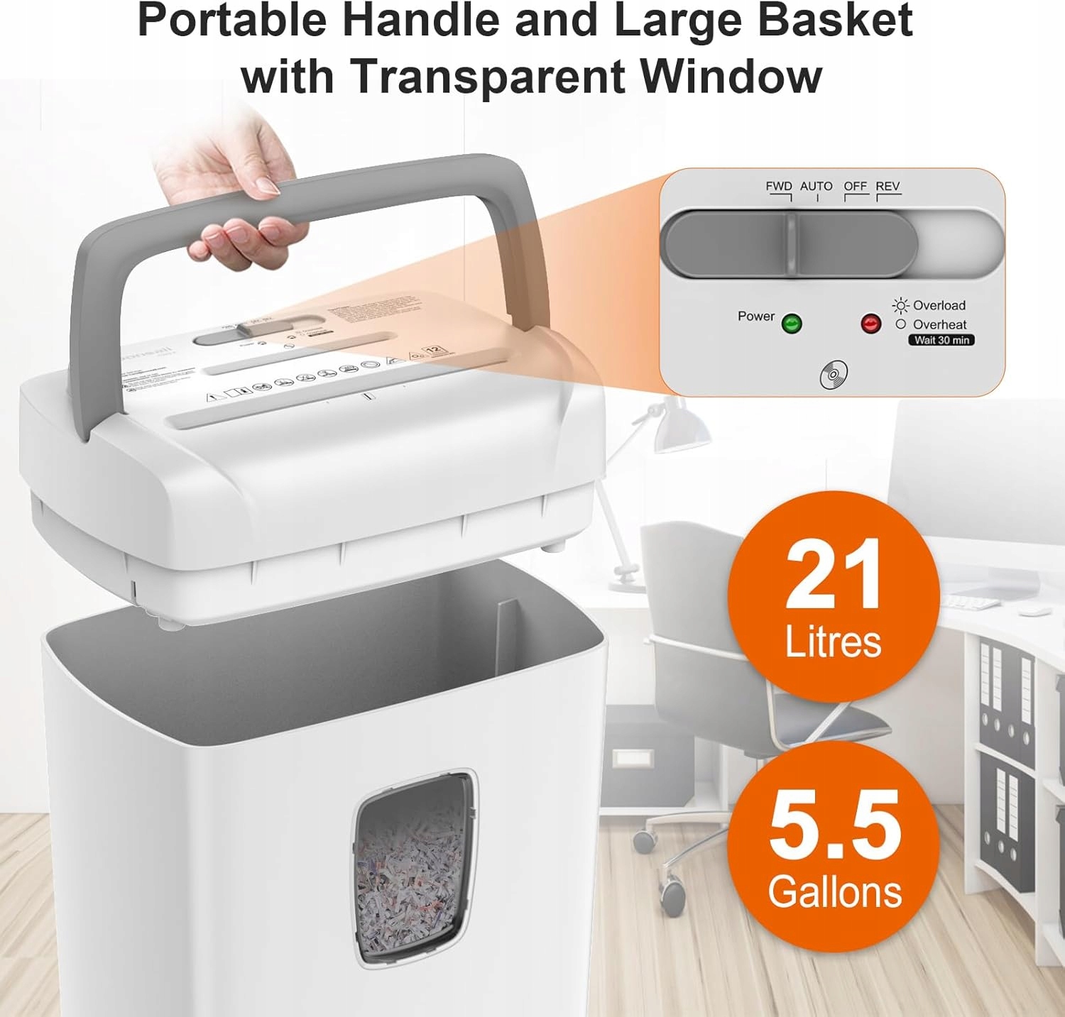 - [велика ємність] 21-літровий паперовий кошик з прозорим переднім вікном, що полегшує перегляд накопичення подрібнених відходів