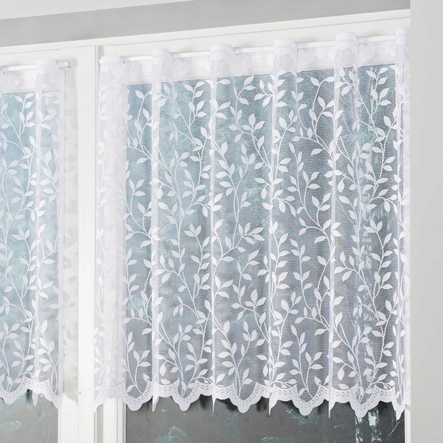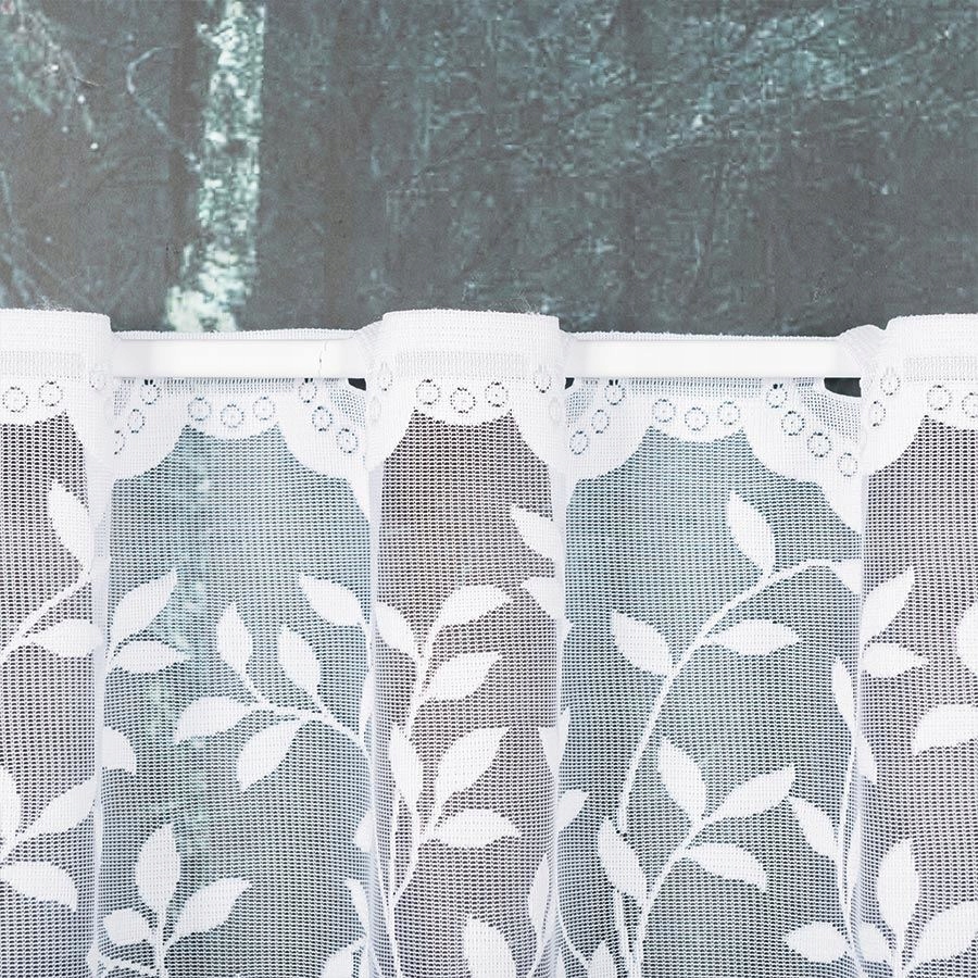 Жакардова штора на метр, висота70смбілого кольору. Зверху має отвори для вставлення палички або палиці. Красивий візерунок зі стильними листочками по всій висоті підійде для будь-якої кухні, ванної чи сходів.