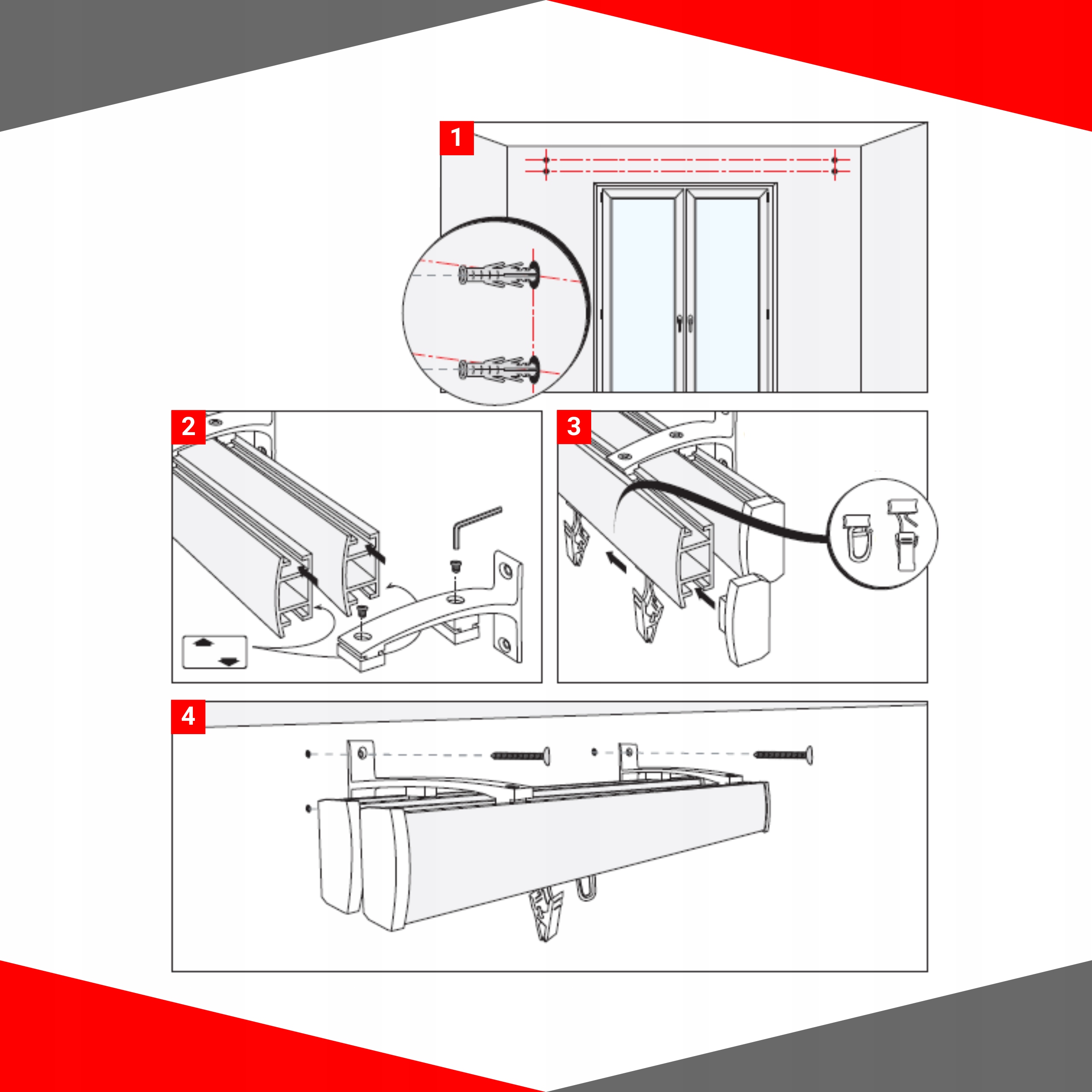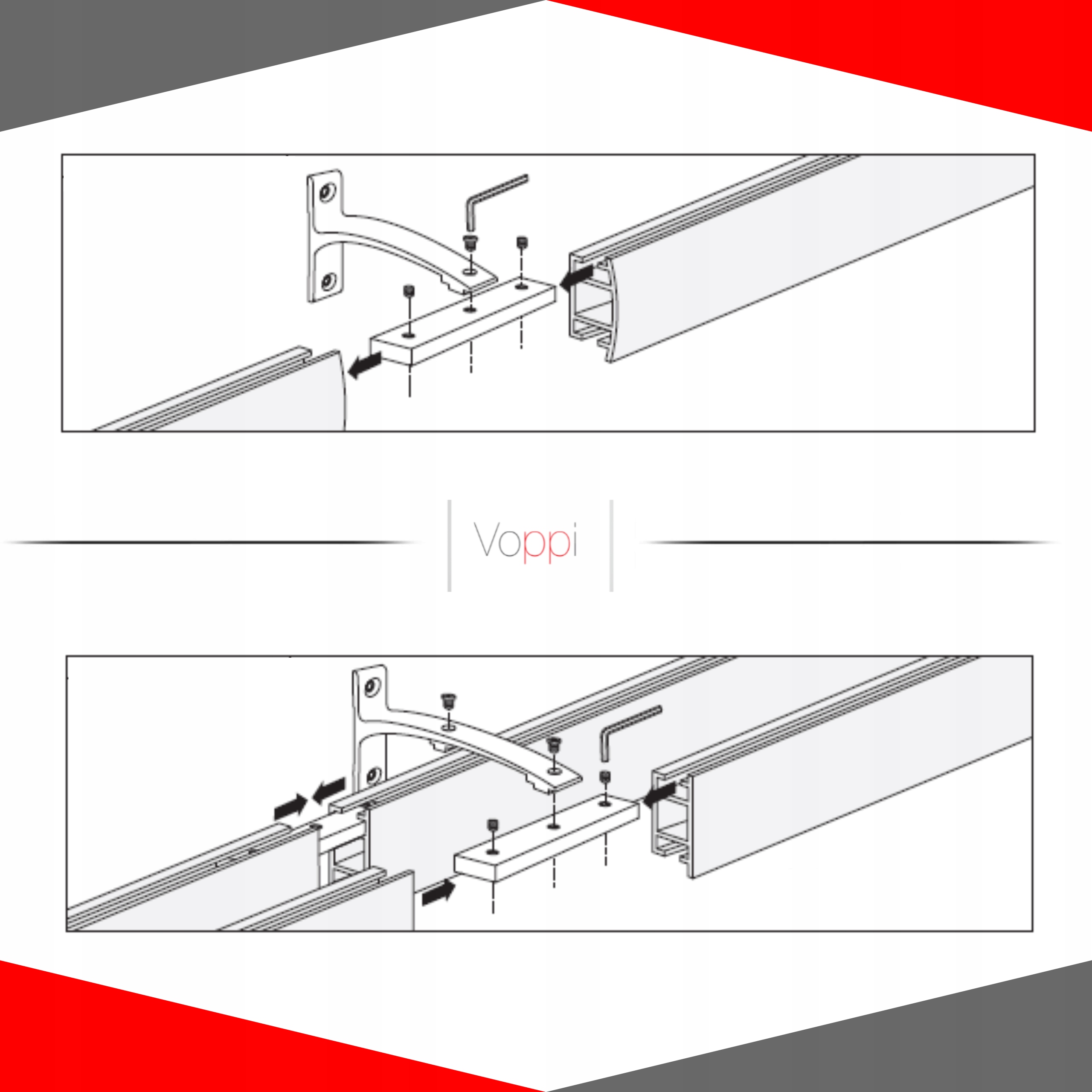 🔴 Як легко підключити один або подвійний штор? 4 Просуньте роз'єми в профілях і відповідайте кріпленням кронштейна і затягніть гвинти ключем масла. Усі елементи з клавішею Allen додаються до монтажних наборів.