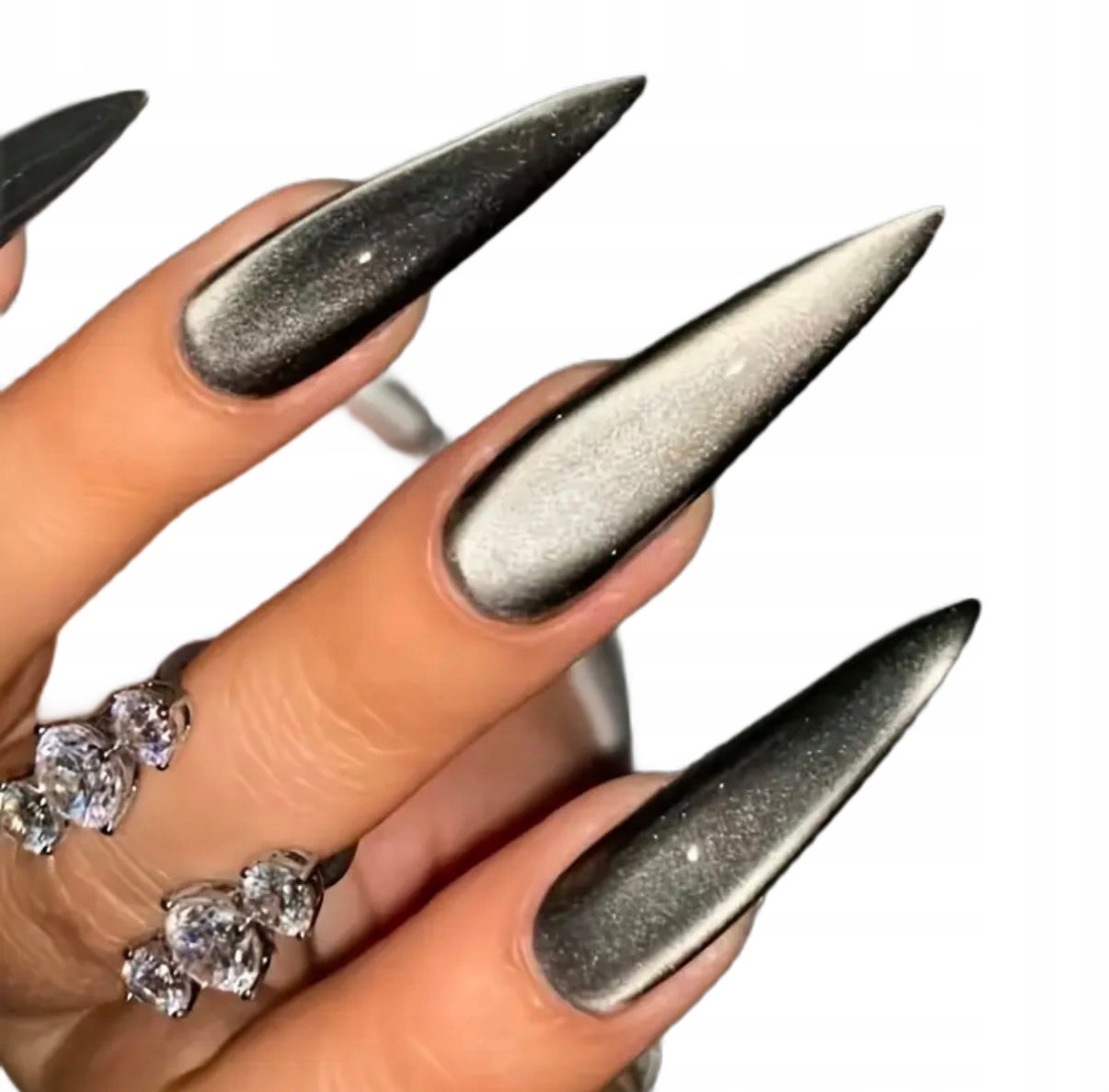 ШТУЧНІ НІГТІ ТІПСИ ДОВГИЙ МИГДАЛЬ ШПІЦ ЧОРНИЙ СРІБНИЙ HOLO CAT EYE