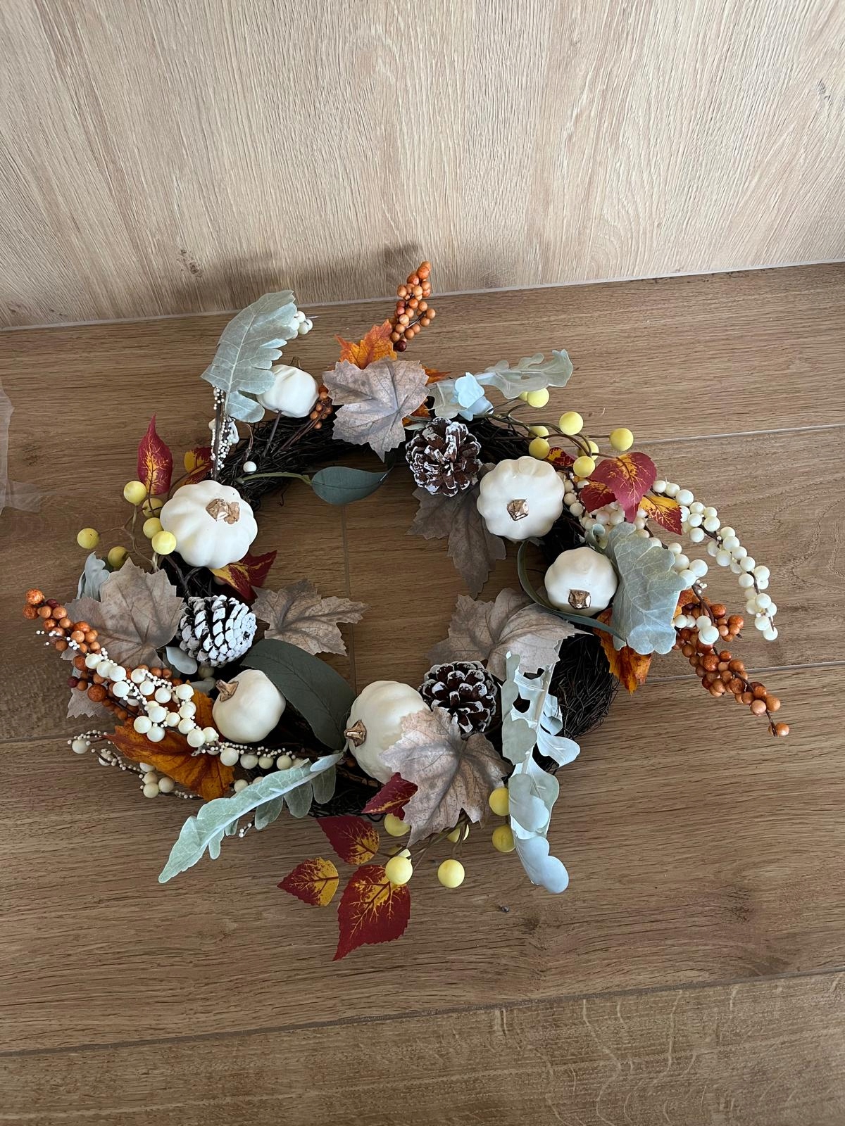 Осінній вінок з діаметром близько 45 см виготовлений з високоякісних матеріалів, поєднуючи штучні гарбузи, кленові листя та природні шишки та гілочки, що надає йому справжній, теплий вигляд.
