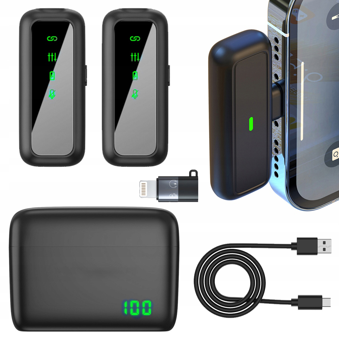 ☑️У набір входять два бездротових мікрофона з вбудованими акумуляторами та портативний джерело живлення 300 мАг для тривалого часу автономної роботи.