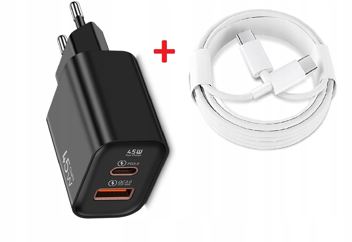 ШВИДКИЙ МЕРЕЖЕВИЙ ЗАРЯДНИЙ ПРИСТРІЙ 45 ВТ ДЛЯ ТЕЛЕФОНУ 1xUSB 1x USB-C + ШВИДКИЙ КАБЕЛЬ