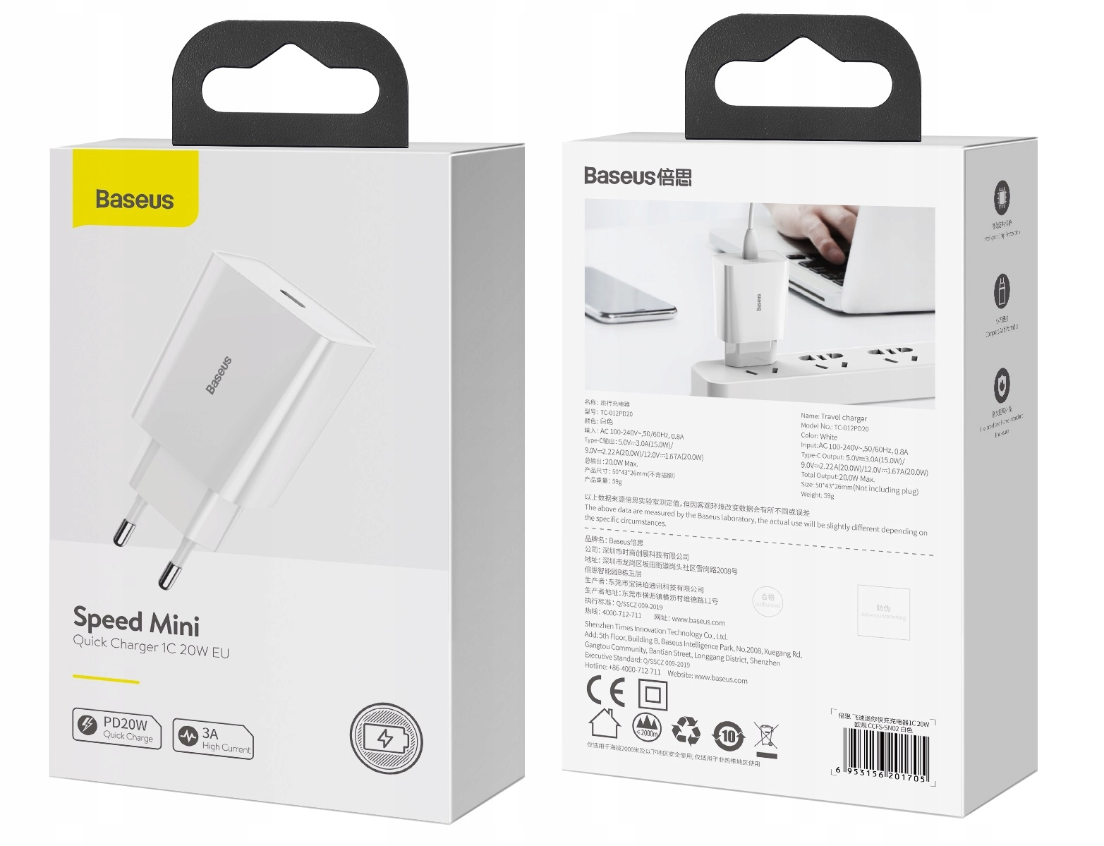 ШВИДКИЙ МЕРЕЖЕВИЙ ЗАРЯДНИЙ ПРИСТРІЙ BASEUS БЛОК ЖИВЛЕННЯ USB-C TYPE-C 20W PD QC 3.0