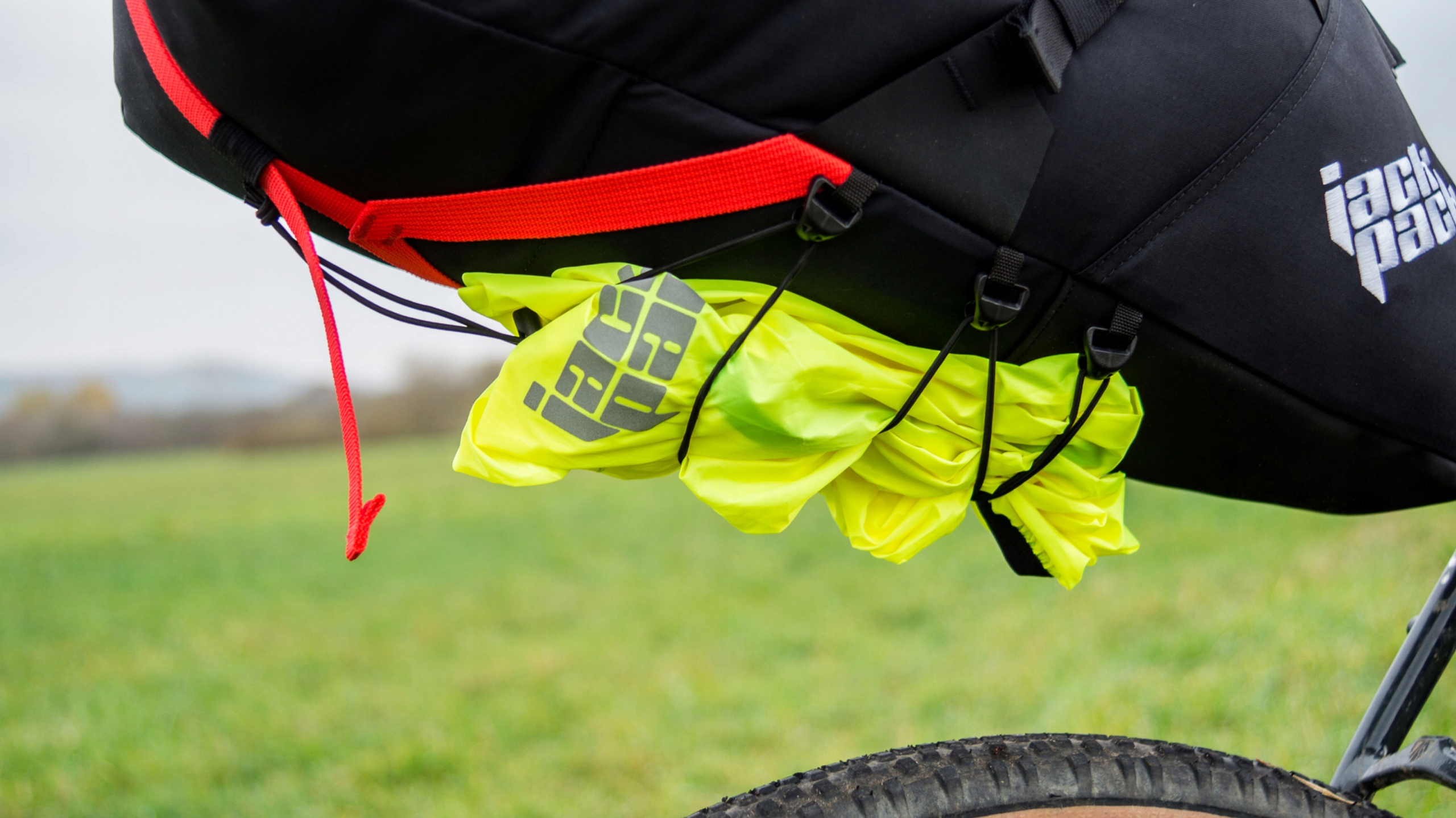 Кожний пакет Bundle 2.0 постачається з відповідним футляром для транспортування. Це надає нам додаткові водонепроникні властивості. Підсідельний штир часто служить бризковиком, а чохол захищає його від бруду та бруду. Знявши його, маємо чистий пакет. На задній частині є світловідбиваючий логотип Jack Pack, який додатково покращує видимість велосипедиста. Безпека перш за все.