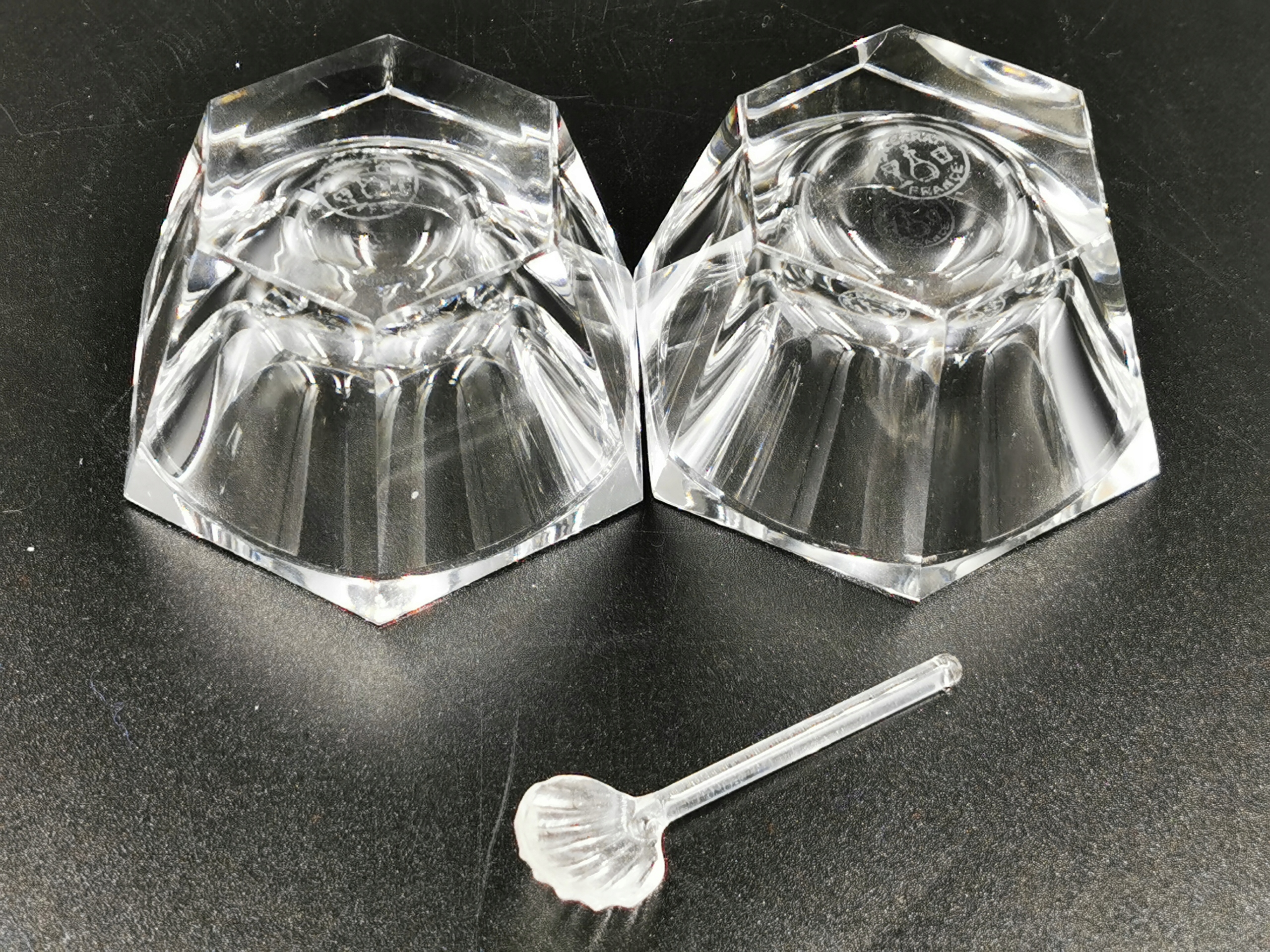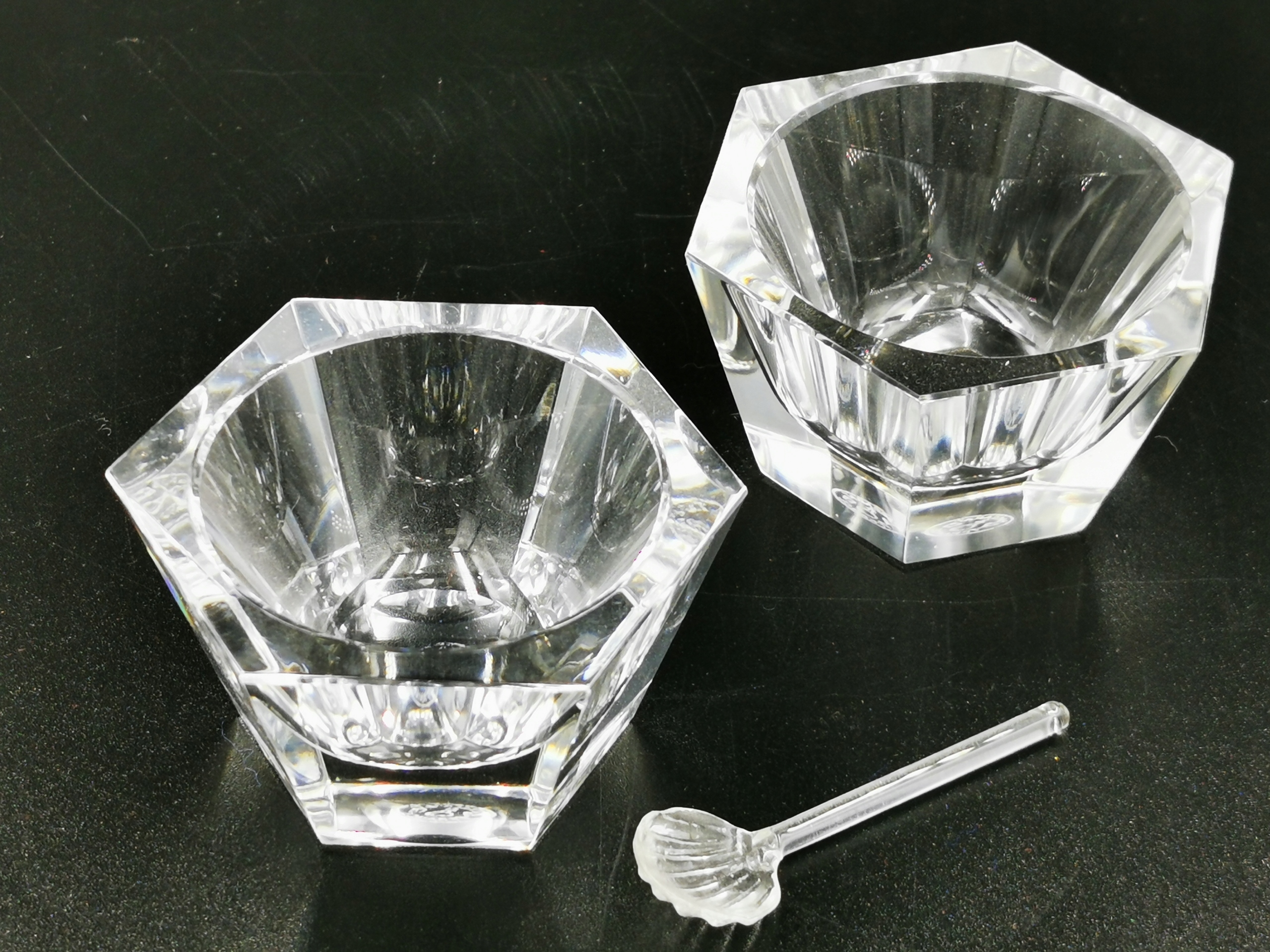 Надзвичайно елегантний набір, що складається з сільнички, перечниці, крихітної ложечки з еліптичною частиною у формі черепашки та дзеркальної підставки, яка вміщує все це. Набір підписаний розкішним логотипом французького бренду Baccarat. Баночка для спецій виглядає дуже ефектно, її характеризує висока якість матеріалу - кришталеве скло, зберігаючи елегантну простоту. Набір 1950-х років.