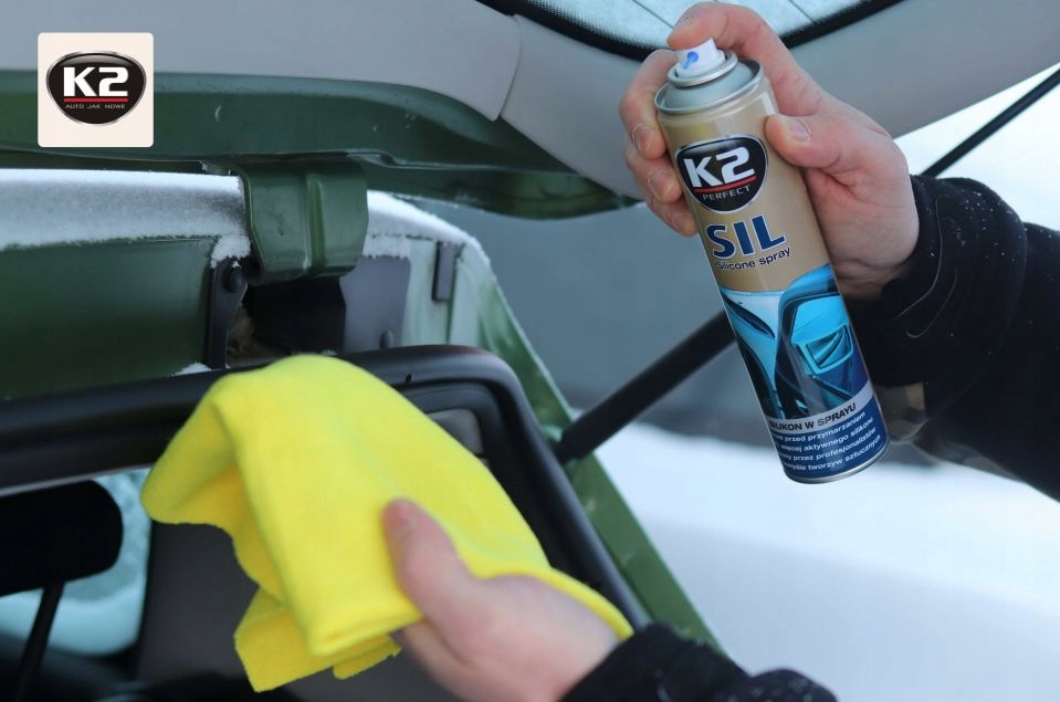 K2 SIL - 100% СИЛІКОНОВИЙ СПРЕЙ повністю професійний продукт для догляду за елементами з гуми та пластику. Ідеально захищає від замерзання гумові ущільнювачі дверей, багажників та інших елементів.