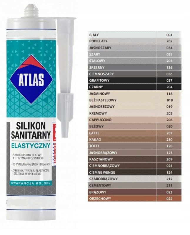 - Продукт доступний у 39 кольорах, включаючи безбарвні, які можна підібрати до кольорів затирки ATLAS.