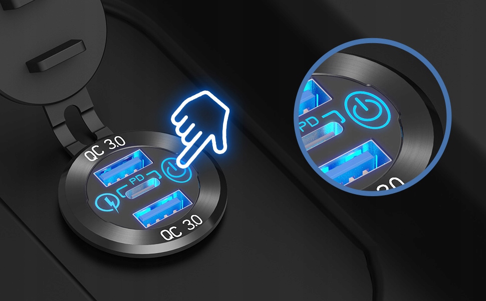 Наш продукт має сенсорний перемикач, який керує джерелом живлення трьох портів зарядки. Ви можете легко вимкнути роз'єми, коли вони не використовуються, тим самим запобігаючи освітленню акумулятора після запуску двигуна. Кнопки Touch також мають функцію пам'яті, яка дозволяє запам'ятати останній стан комутації.