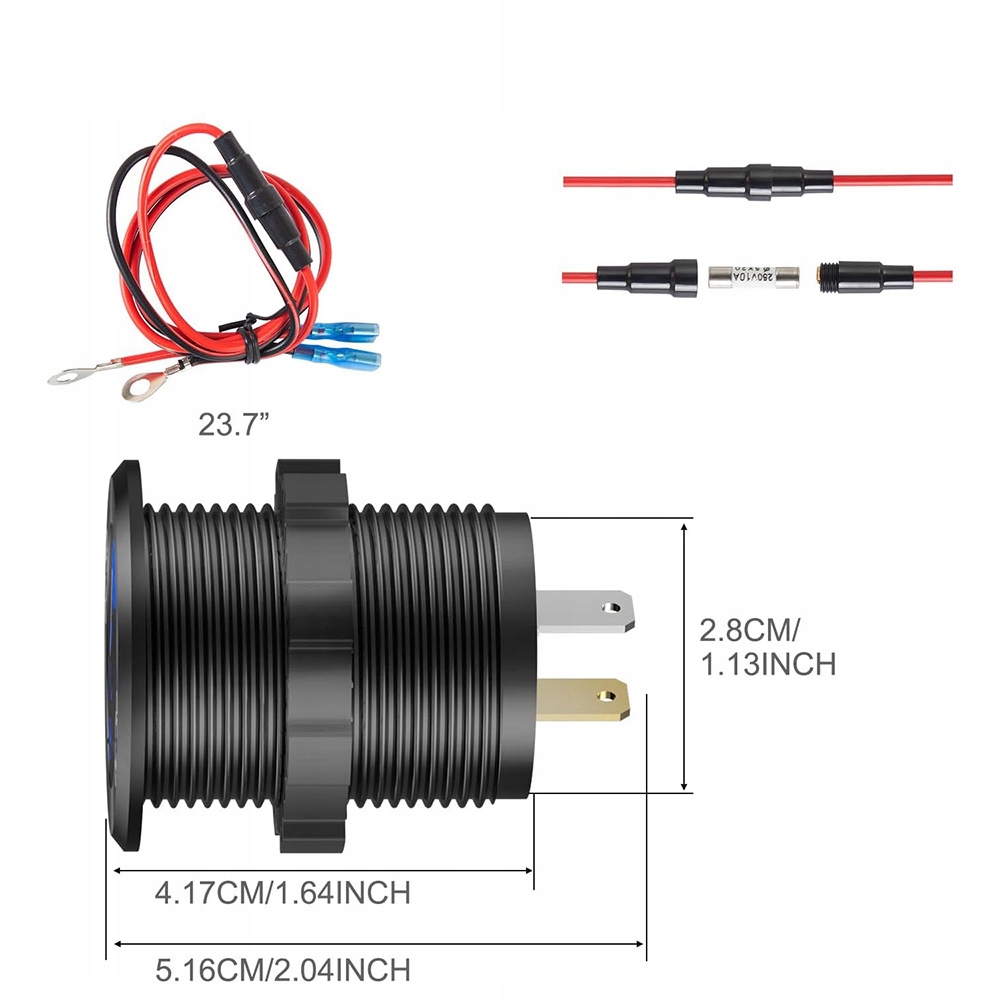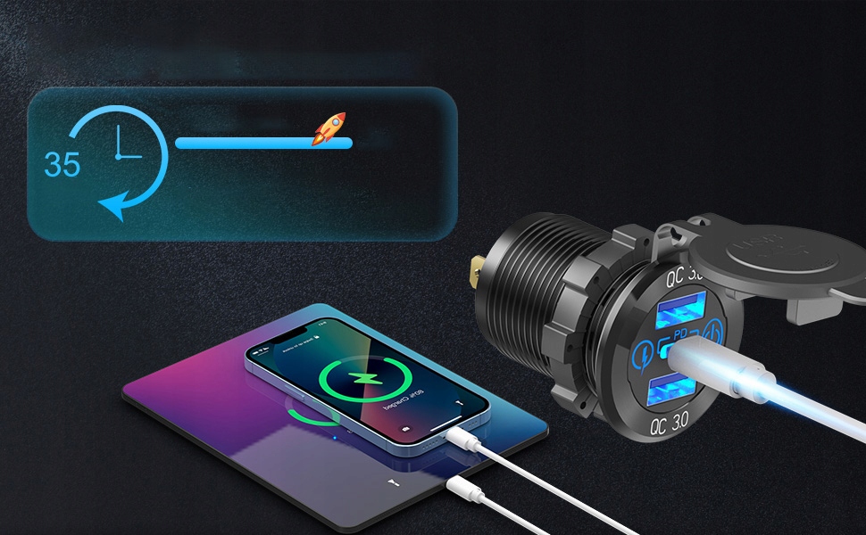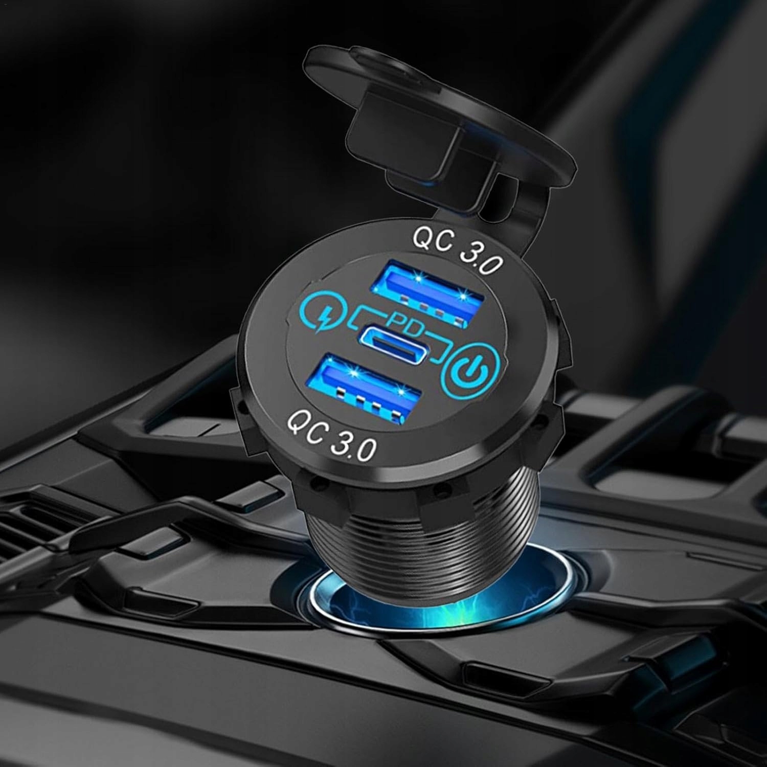 Розетка з зарядним пристроєм для автомобілів підходить для всіх автомобілів, вантажних автомобілів, фургонів, будинків, караванів, мотоциклів, транспортних засобів ATV та інших транспортних засобів з напругою 12–24 В постійного струму. USB -розетка сумісна з iPhone, iPad, планшетами з Android, мобільними PowerBans, контролерами відеоігор, спортивними годинниками та іншими електронними пристроями, що використовують живлення PD та USB.