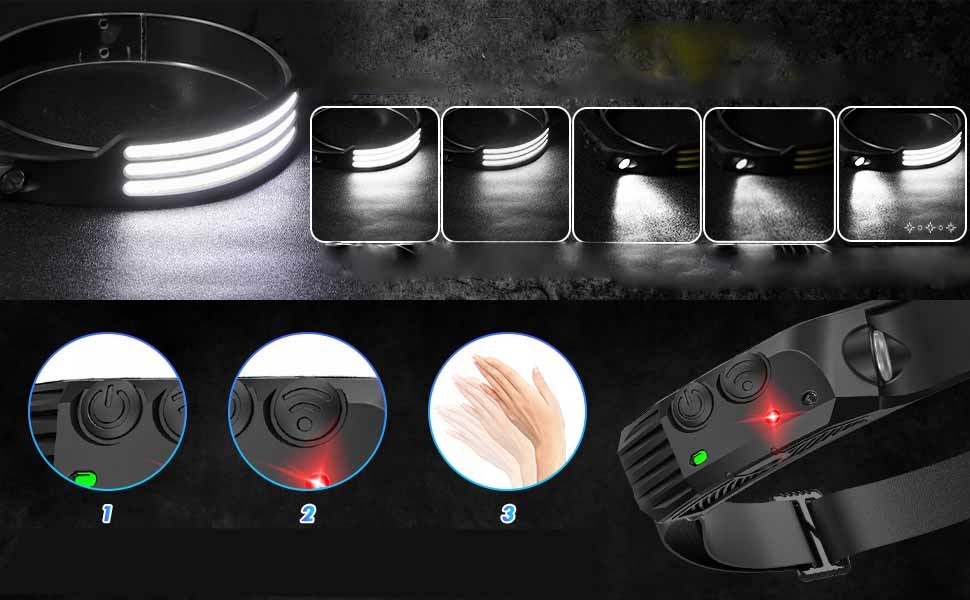 - 🔦 Ви можете легко перемикатися між 5 режимами освітлення: COB LED High, LED LED LED, LED LED High, LED LED LED, режим світлодіодного світлодіодного XPE XPE . Фара , ви можете увімкнути або вимкнути фари, просто махаючи рукою, не доторкнувшись до неї.