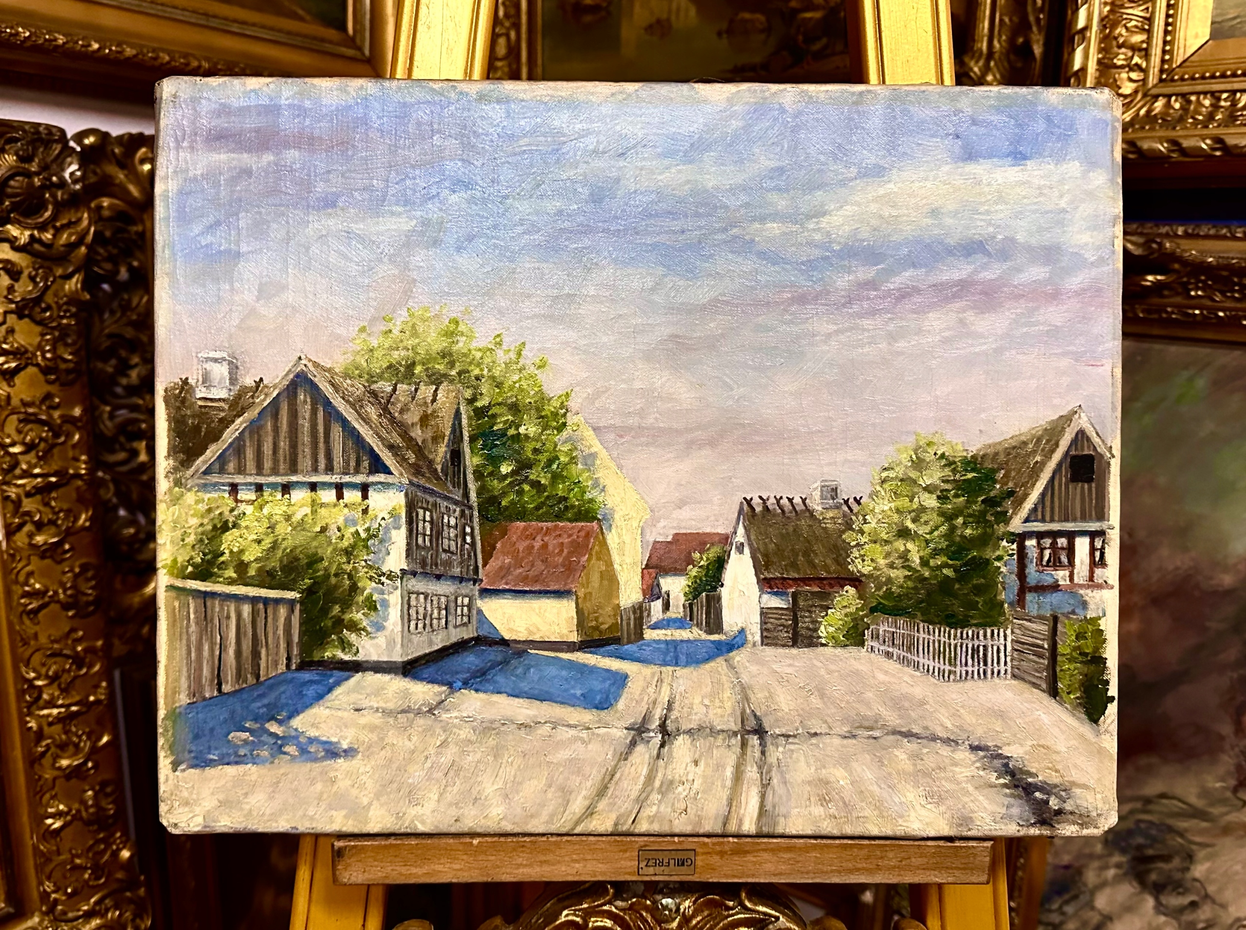 СІЛЬСЬКА ДОРОГА СЕРЕД СТАРИХ БУДИНКІВ КРАСИВА ОЛІЙНА КАРТИНА НА ПОЛОТНІ
