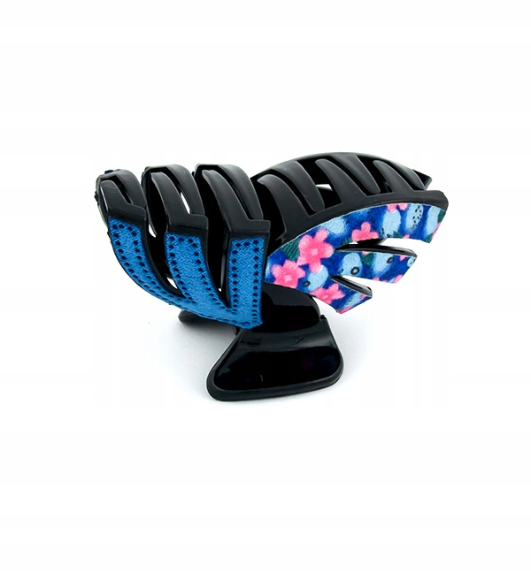Він прикрашений з обох боків матеріалом. Пряжка виготовлена з чорного пластику, а декоративний матеріал у синіх та барвистих квітках.