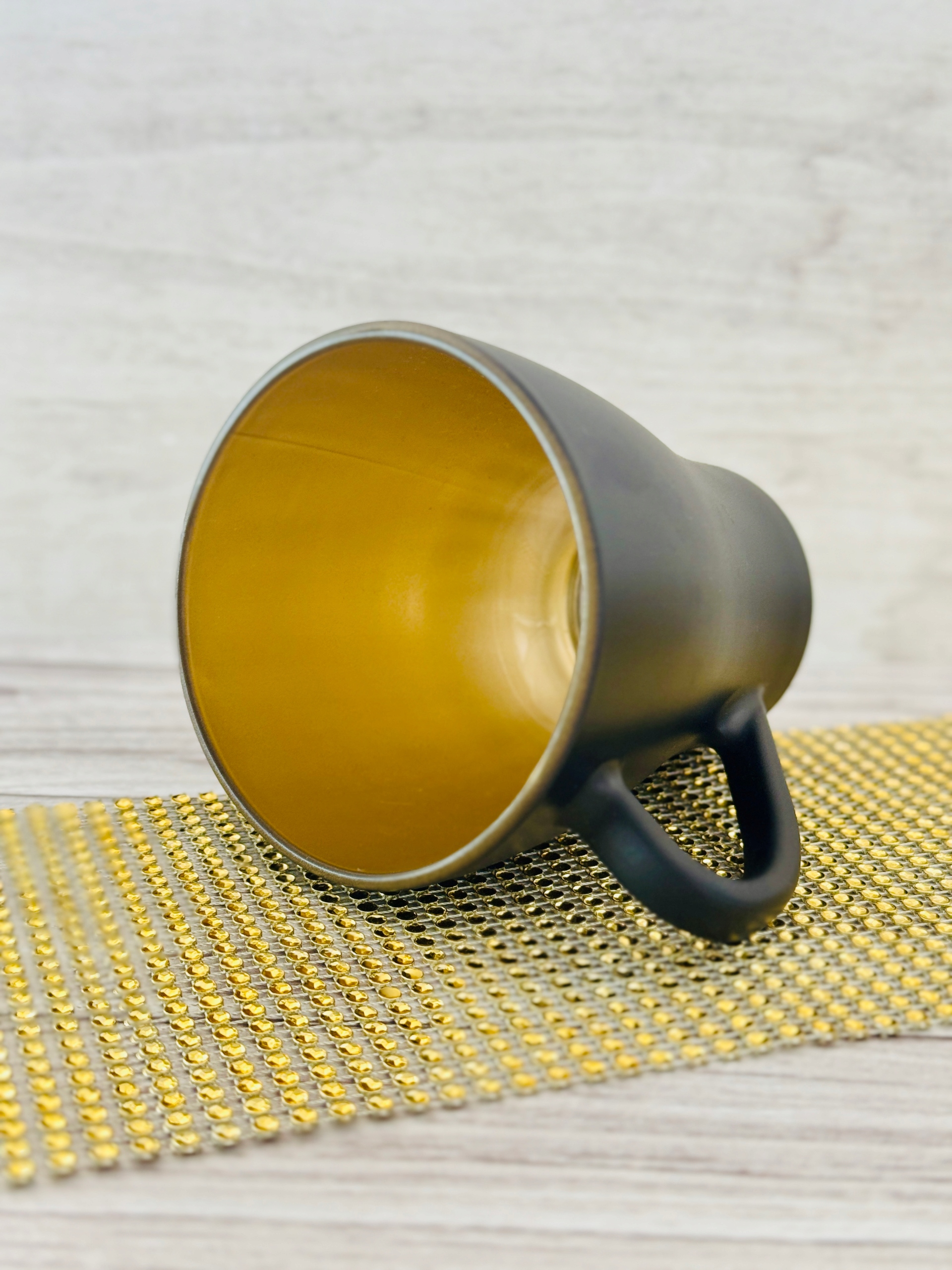 - The mug is made of GLASS, black on the outside, gold on the inside