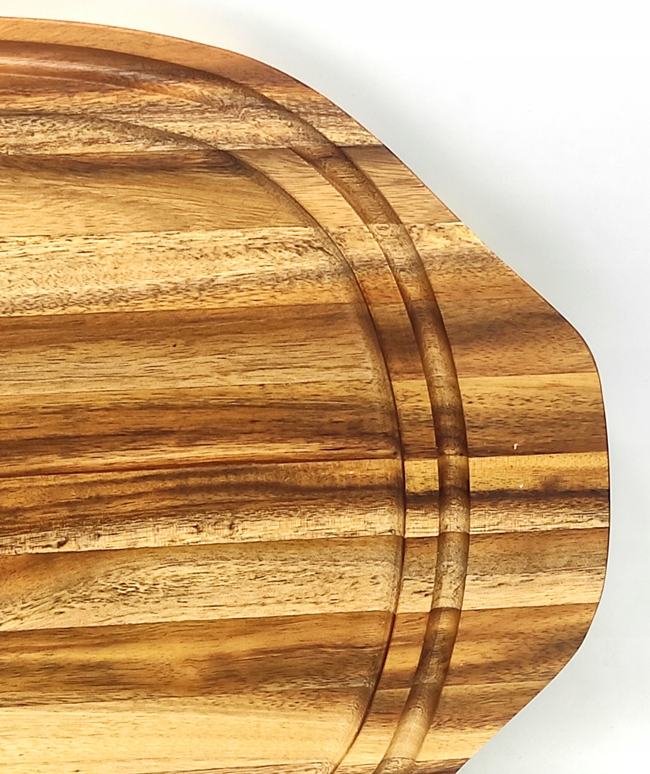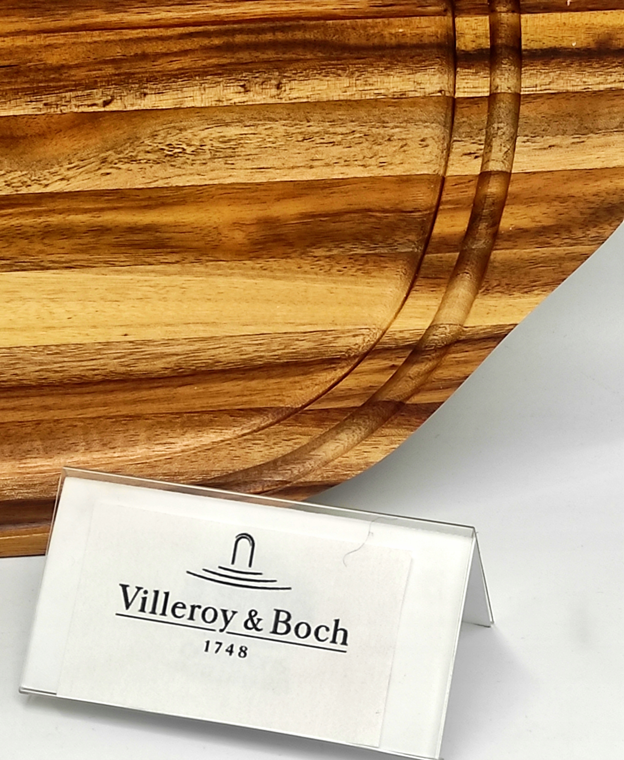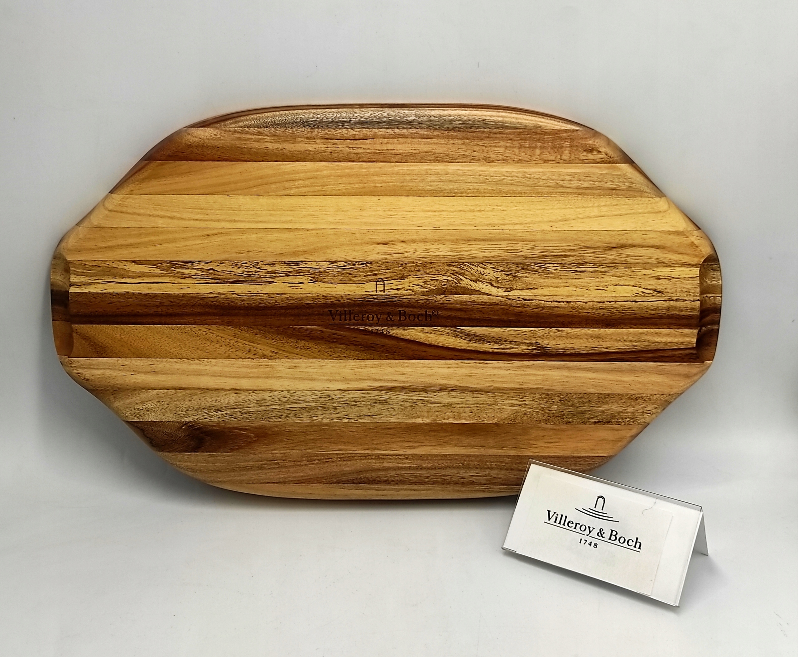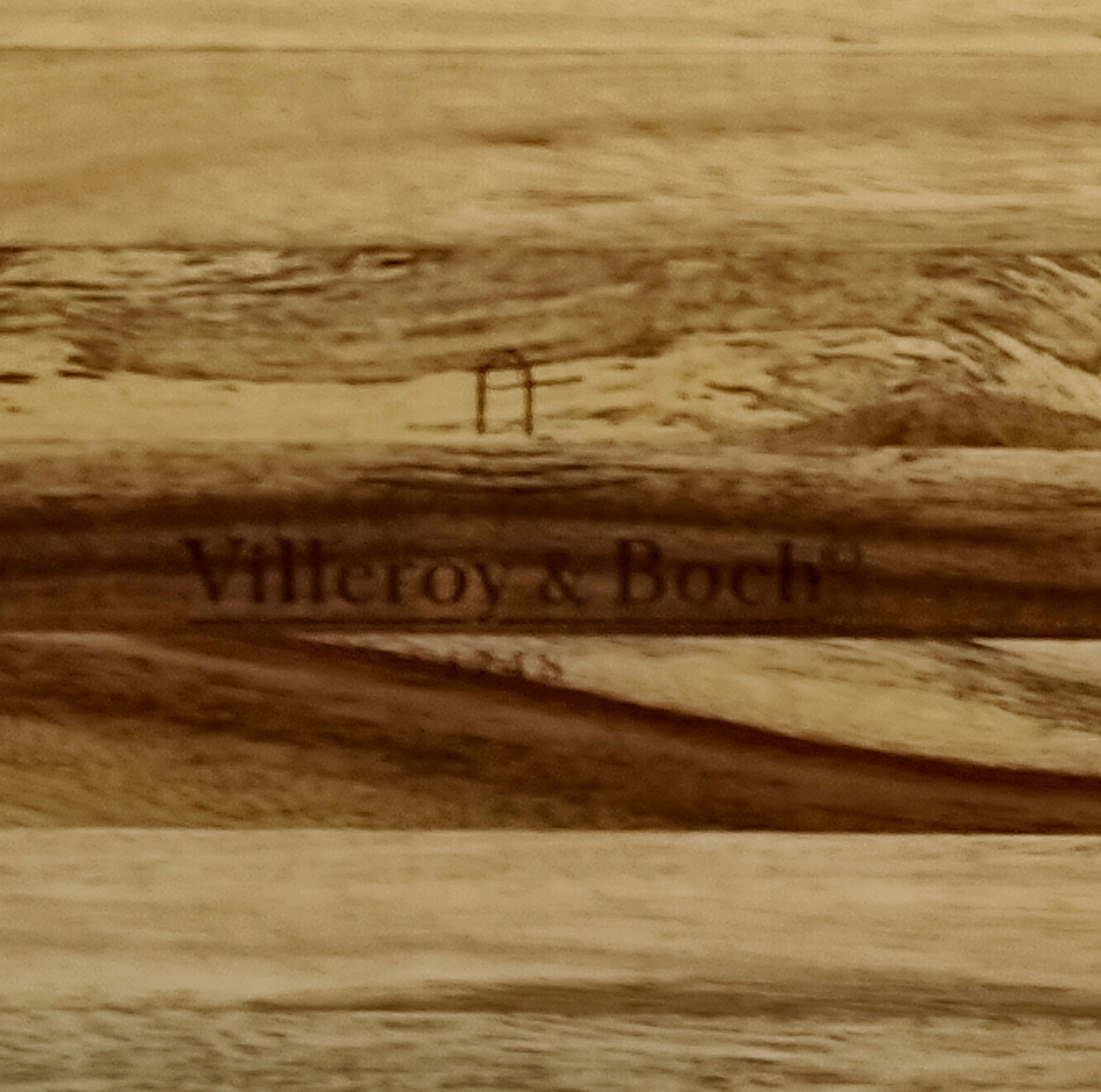 Він виготовлений із красивого дерева акації. Його форма овальна, з боків є ручки. Підписано знизу логотипом Villeroy&Boch. Кольори просто приголомшливі! Темний і світлий ідеально поєднуються, додаючи незвичайний характер і дизайн. Звичайно, кожна з цих дощок трохи відрізняється кольором, тому що це дерево, і те, що ми на ньому подаємо, залежить тільки від власника, нехай ваша фантазія веде вас.