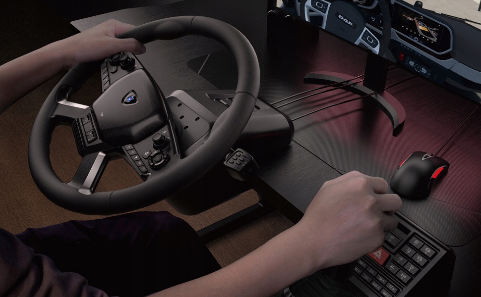 Розроблений спеціально для тренажерів вантажівки, повний розмір 15,8 -дюйм/40 см з 1800 градусами забезпечує плавне та стабільне поводження під час маневрів повороту та паркування. Крім того, рульове управління оснащене важелями з обох боків, що дозволяє реалістичну роботу склоочисників, індикаторів напрямку та гальмування.