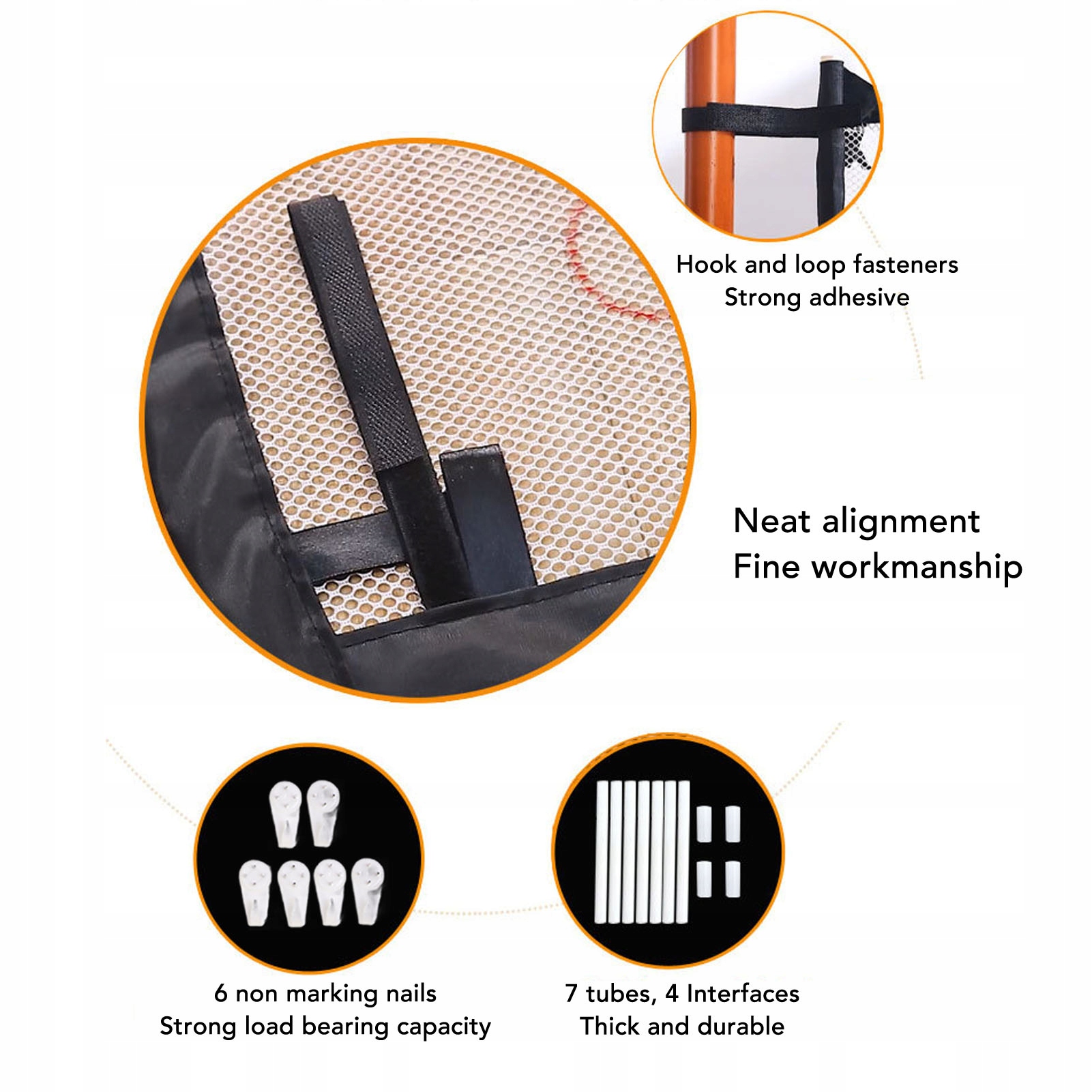 2 . Легке встановлення: сітчасті ворота для дітей і домашніх тварин мають простий процес налаштування. Просто прикріпіть чотири самоклеючі гачки до стіни або іншої плоскої гладкої поверхні, розмістіть висувні стрижні з обох боків сітчастої тканини та повісьте сітчасту тканину на гачки. Немає необхідності свердлити отвори в рамах або стінах, тому цей продукт легко збирати та розбирати.