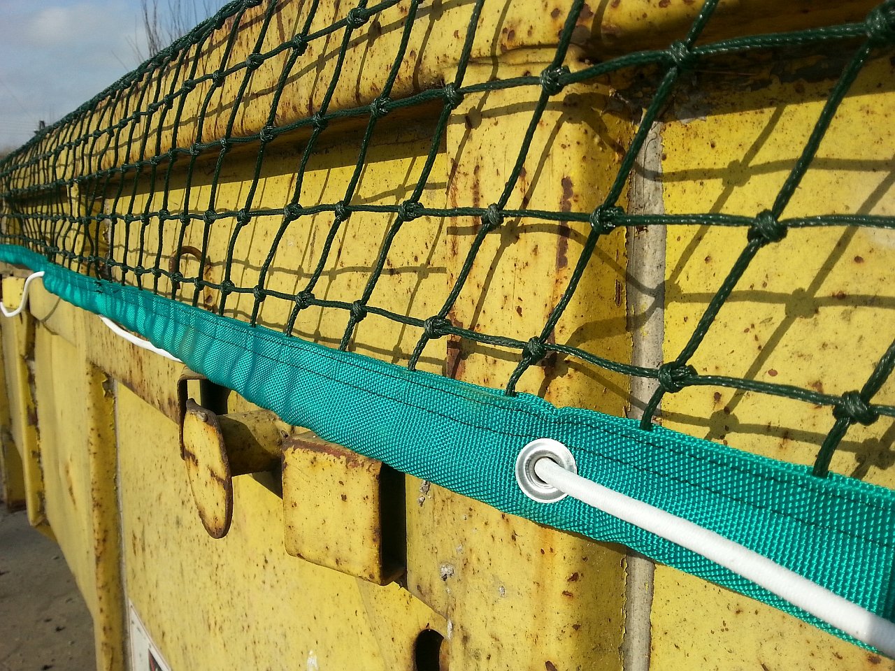 Краї контейнерної сітки безкоштовні та оброблені більш товстим швом (близько 5 мм завтовшки) із вшитою армуючою мотузкою всередину.