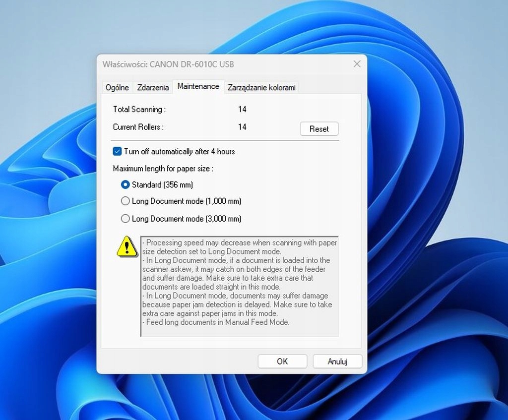 - Режим обробки довгих документів: Макс. 3000 мм (можна налаштувати з панелі керування MS Windows)