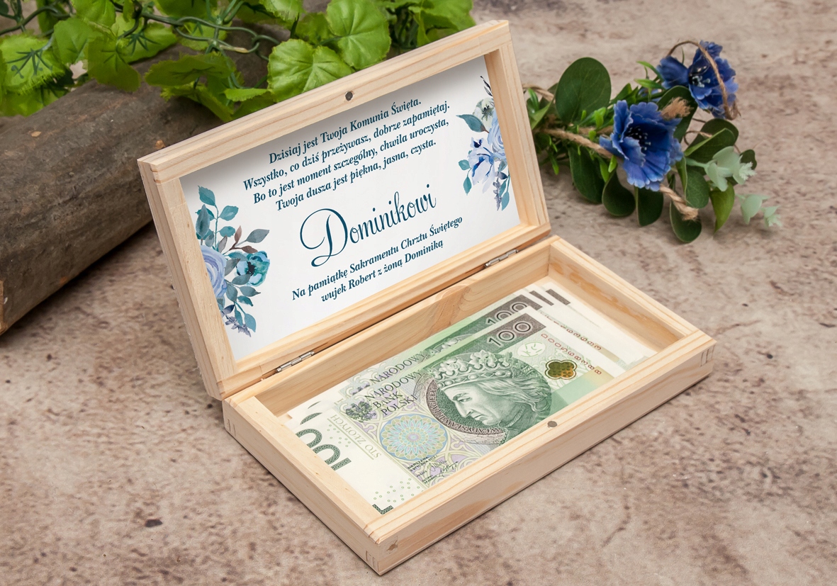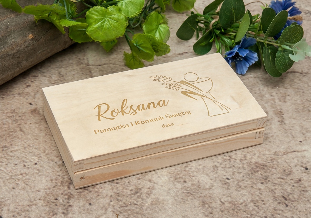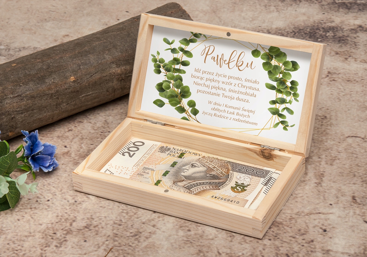 Скарбничка замість конверта - світле натуральне дерево - пам'ять про Перше Святе Причастя.