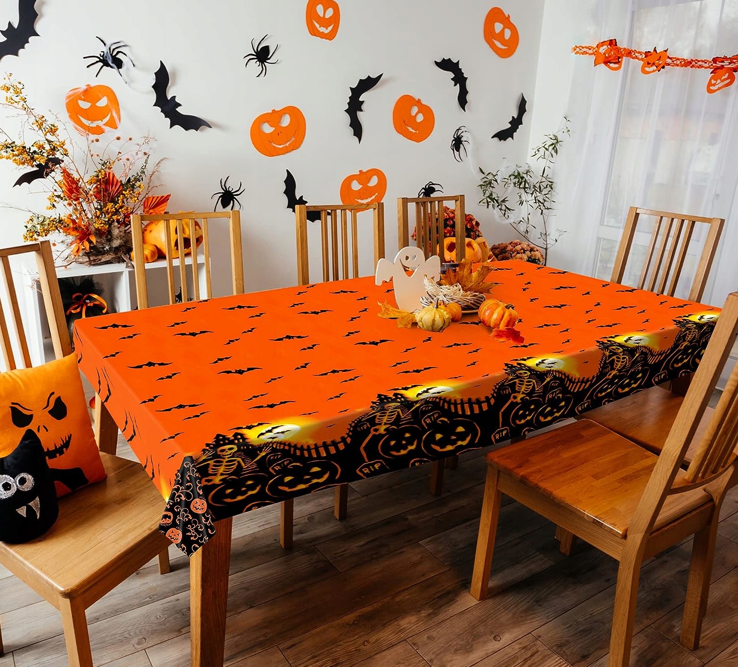 Ця скатертина, прикрашена гарбузом, скелетом, кажаном і будиночком мисливця, повністю створена для Хелловіна. Покладіть її на стіл, щоб зробити свій Хелловін ще особливішим! Скатертина одноразова, але її можна використовувати повторно, якщо ви почистите її! Сервіровку легко підтримувати в чистоті, досить протерти її вологим рушником, і скатертина буде чистою. Одноразова скатертина виготовлена з поліетилену (вінілацетату), якийхарактеризується хорошою водостійкістю, стійкістю до розриву та довговічністю.