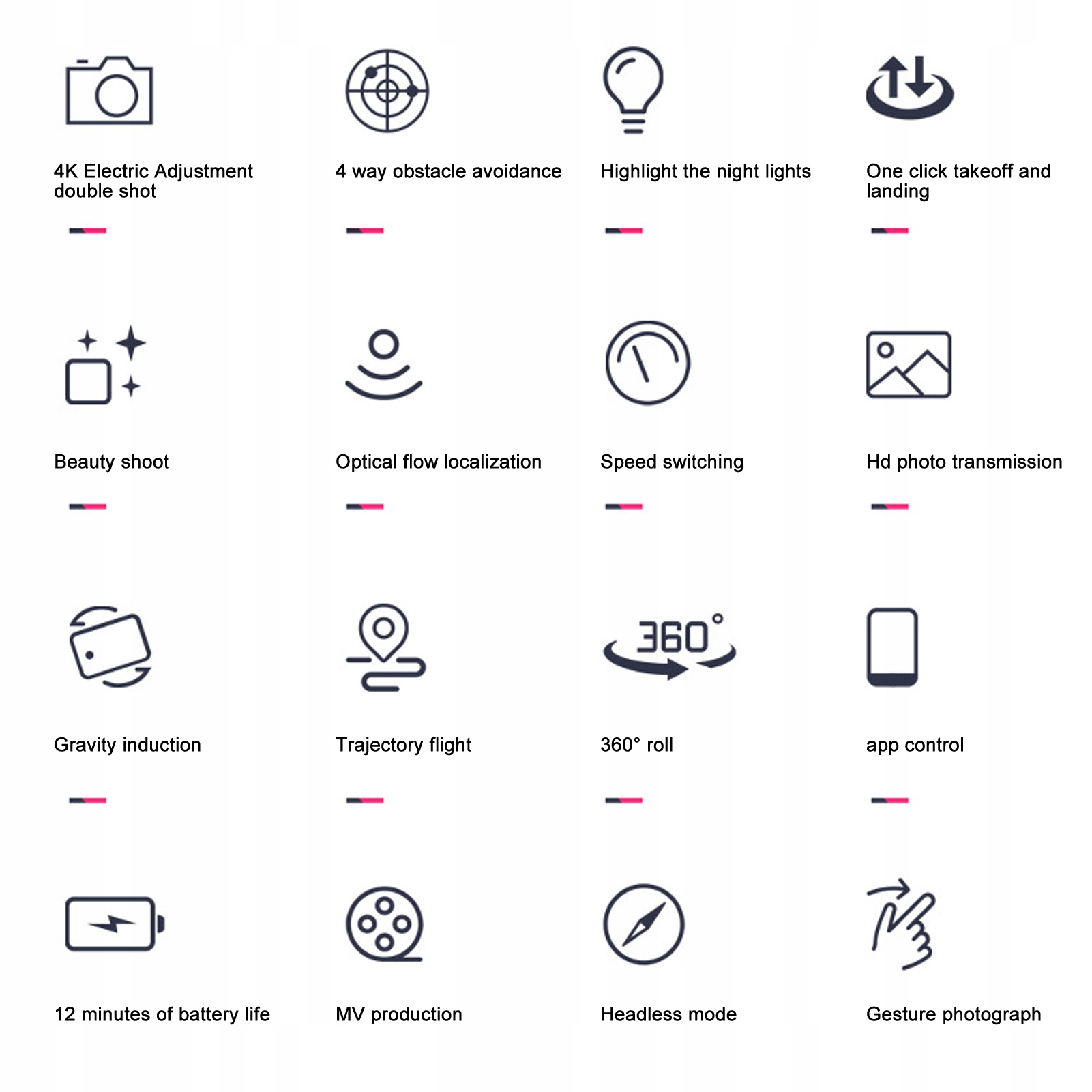1. Подвійна HD-камера: RC Quadcopter оснащено подвійними лінзами 4K HD, які дозволяють знімати чіткі, насичені кольором зображення та відео. 2. Передача зображення по WIFI: складаний дрон можна підключити до WIFI, користувач може передавати дані через WIFI і безперервно переглядати зображення по телефону. 3, 4-сторонній уникнення перешкод: з 4-сторонньою функцією інфрачервоного виявлення, супровід польоту. Він може відчувати відстань до перешкод і уникати їх, коли натрапляє на них, що робить керування легшим і простішим. 4、Складна конструкція: БПЛА має складану конструкцію, невеликий розмір, малу вагу та його легко носити. Користувачі можуть легко взяти його куди завгодно. 5、Зйомка жестами: користувачі можуть наводити на камеру дрона та виконувати відповідні жести під час польоту дрона, щоб знімати фото чи відео.