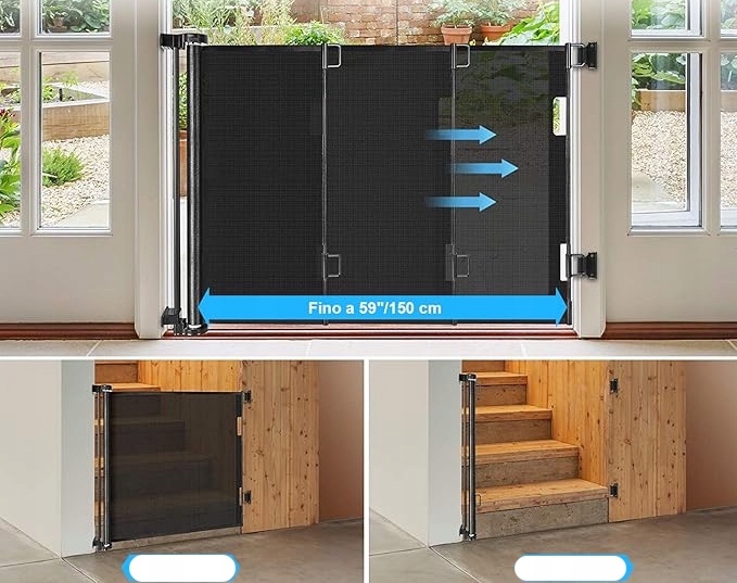 - [Розширена конструкція]: Ця захисна ворота для дітей для сходів може бути розширена до ширини 150 см і висотою 86 см. Він займає мало місця і розширено. Сітка може бути повністю згорнута, коли вона не використовується, без необхідності розібрати її. Він був розроблений, щоб відповідати двері до 150 см завширшки. Це зручно і економить місце.