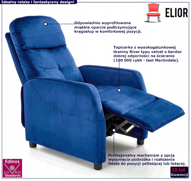 Крісло для відпочинку Amigos 3X вирізняється не лише класичною та елегантною формою, але й використанням матеріалів найвищої якості. Крісло оббито надзвичайно м’якою оксамитовою тканиною, наповненою відповідним товстим шаром оббивної піни з функцією пам’яті, яка запобігає деформації. Наповнювач має високий ступінь твердості, ідеальну еластичність і високу щільність, що гарантує комфорт використання. Ергономічна форма крісла адаптується до хребта, забезпечуючи адекватну підтримку шийно-поперекового відділу, завдяки до якого ви забудете про болі в спині. Додатковою перевагою є механізм, який дозволяє висувати підніжку, відкидати спинку назад і розкладати крісло в положення напівлежачи або лежачи. Розслаблення в положенні нахилу назад забезпечує оптимальний кровообіг, полегшує напруга м'язів і сприяє комфорту. Перевірте, як фантастично ви відпочинете в кріслі Amigos 3X від Elior.