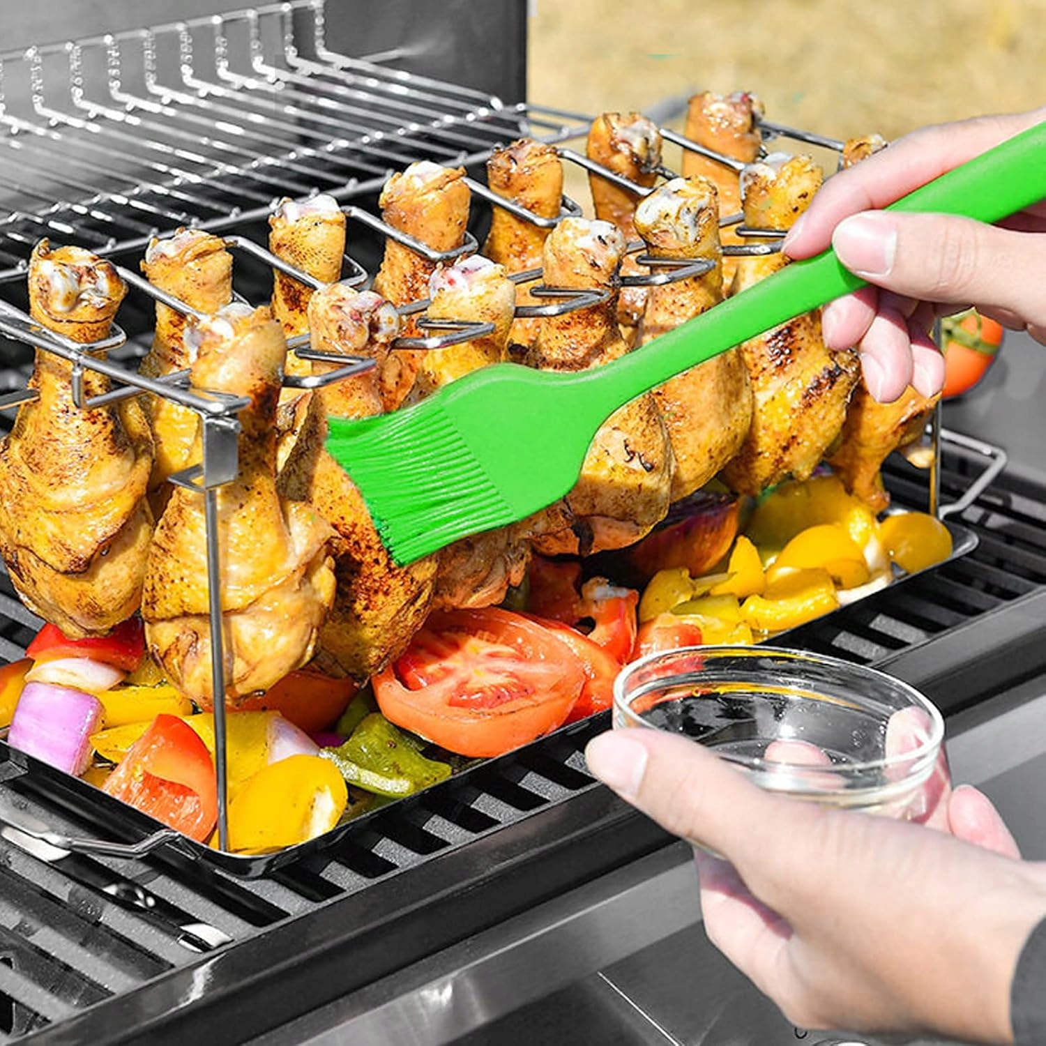 ⭐При покупці підставки для курячих гомілок, крім підставки для гомілок, ви також отримуєте піддон і щітка з нержавіючої сталі. Матеріали виробництва виготовлені зі здорових та екологічно чистих матеріалів, які безпечні у використанні.