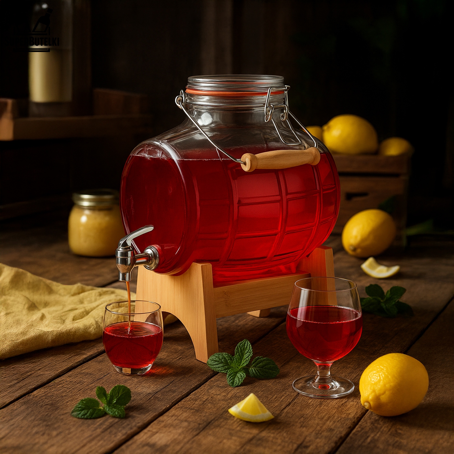 Скляна 8l бочка з краном і ручкою - це елегантне і функціональне блюдо, яке поєднує класичний вигляд із сучасною зручністю використання. Ідеально підходить для зберігання та подачі домашніх напоїв, соків, лимонійців та інших напоїв - як під час повсякденного використання, так і для вечірок чи сімейних зустрічей.