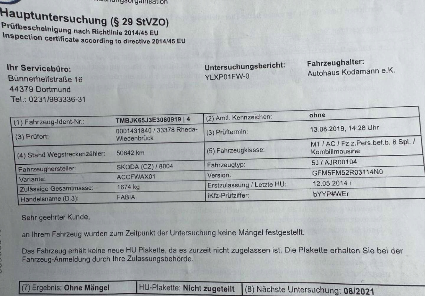Легенда служби для підтвердження після Віне № в Skoda Aso